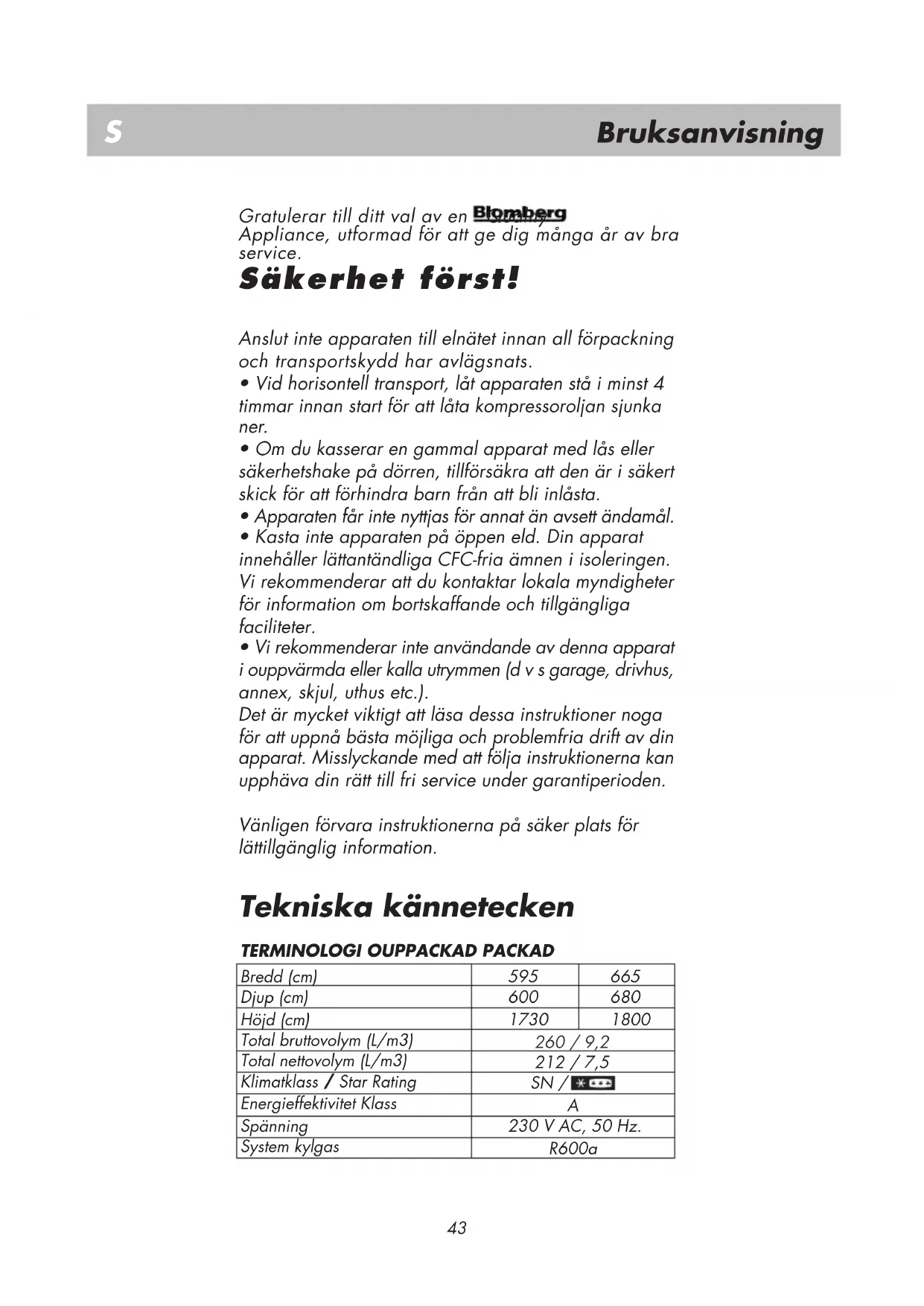 - Kasta ej apparaten på öppen eld. Vid , tfinns ett fortgående engagemang för vårdande och skydd av naturen. Denna apparat, som är en av de nyaste på marknaden, är särskilt miljövänlig. Din apparat innehåller CFC/HFC-fria naturliga ämnen i kylsystemet (kallat för R600a) och isoleringen (kallat för cyklopentan), som kan antändas om de utsätts för eld. Se därför till att inte skada apparatens kylkretsar/rör under transport eller drift. Vid skada, utsätt inte apparaten för eld eller möjlig antändningskälla och vädra genast ur utrymmet där apparaten finns.