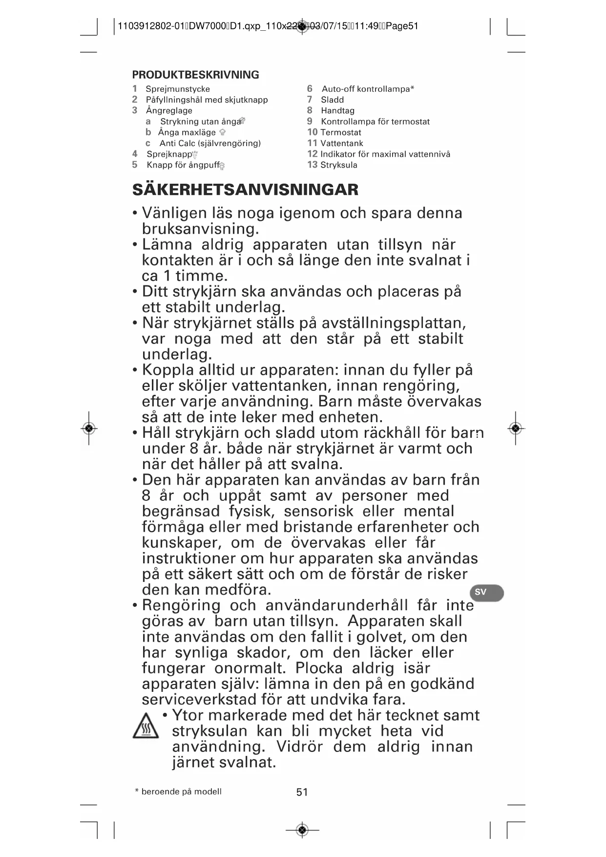 SPARA DENNA BRUKSANVISNING FÖRE ANVÄNDNINGEN Observera! Ta bort eventuella dekaler från stryksulan innan ni värmer upp