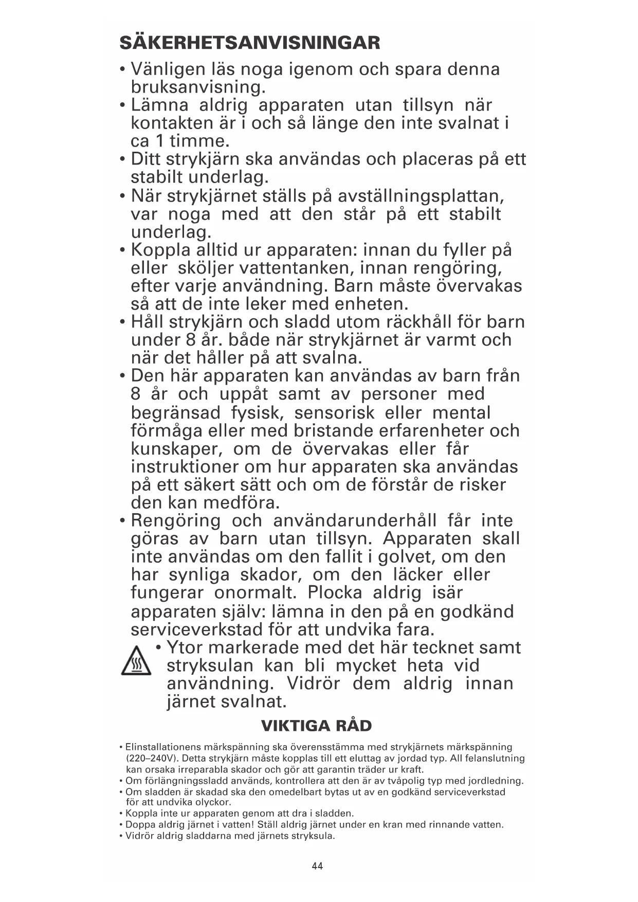 • Håll strykjärn och sladd utom räckhåll för barn
