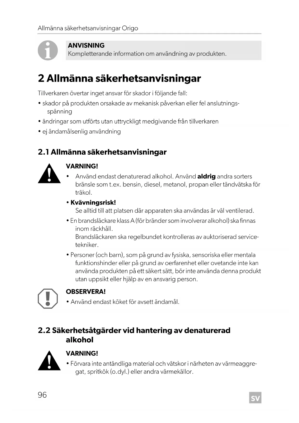 Origo-A100-A200--O-16s.book Seite 96 Freitag, 18. Mai 2018 10:40 10SV Origo Allmänna säkerhetsanvisningar