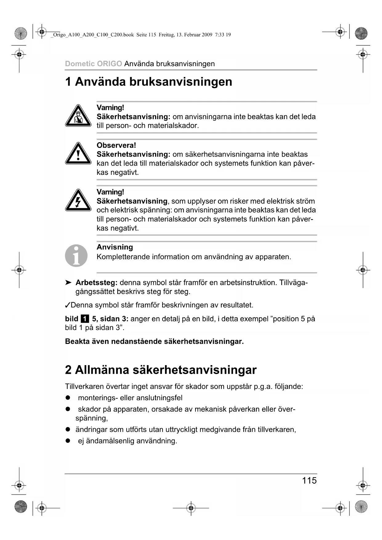 _Origo_A100_A200_C100_C200.book Seite 115 Freitag, 13. Februar 2009 7:33 19Allmänna säkerhetsanvisningar Dometic ORIGO