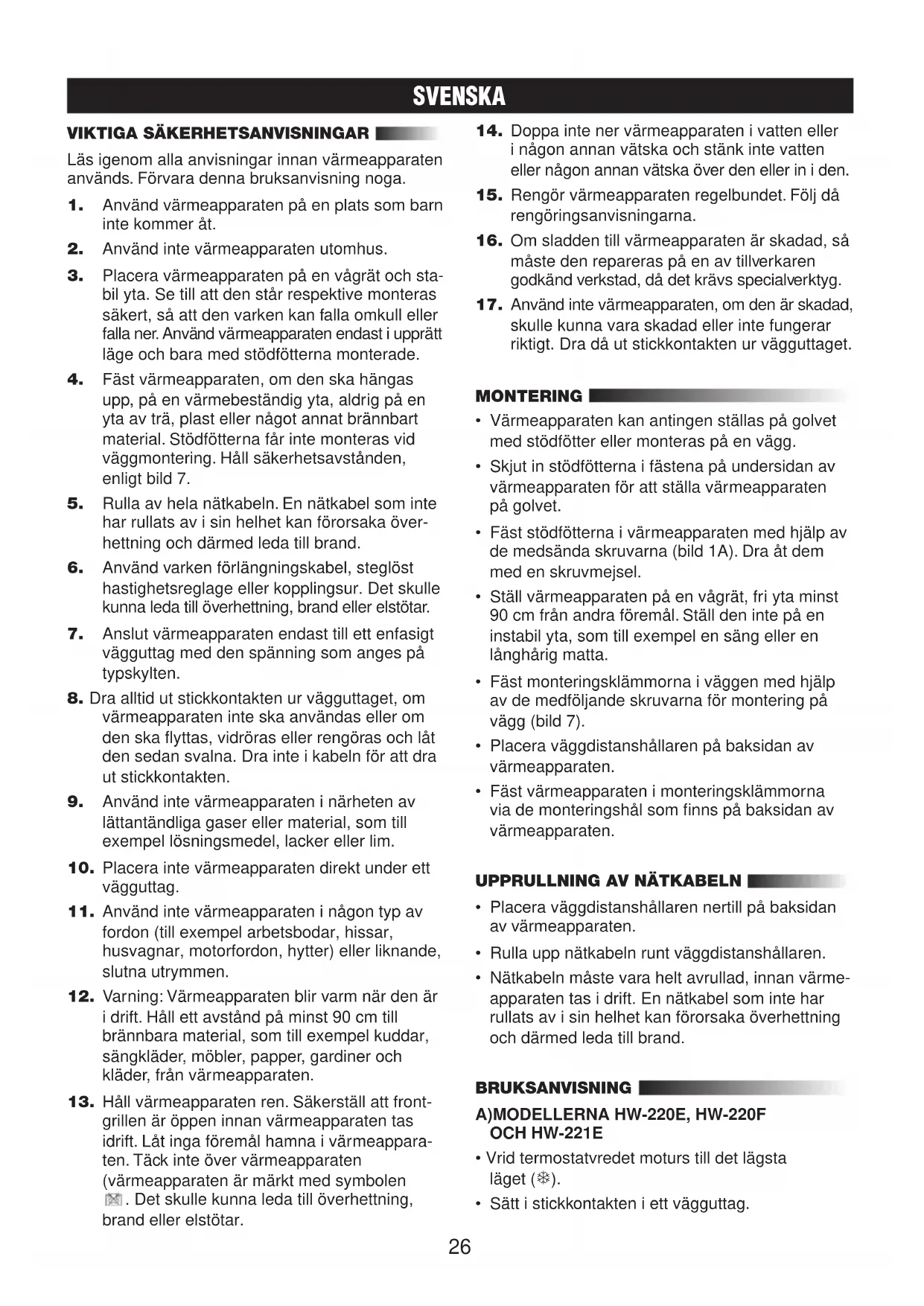 SVENSKA VIKTIGA SÄKERHETSANVISNINGAR Läs igenom alla anvisningar innan värmeapparaten