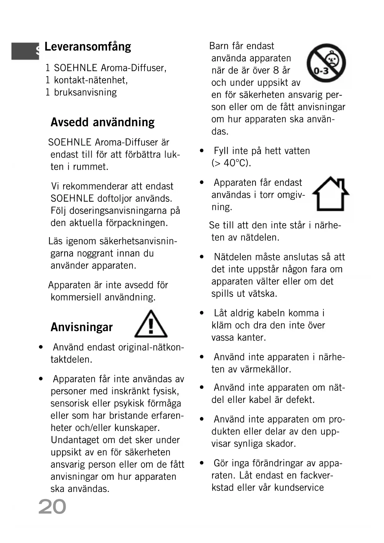Avsedd användning SOEHNLE Aroma-Diffuser är endast till för att förbättra luk- ten i rummet. Vi rekommenderar att endast SOEHNLE doftoljor används. Följ doseringsanvisningarna på den aktuella förpackningen. Läs igenom säkerhetsanvisnin- garna noggrant innan du använder apparaten. Apparaten är inte avsedd för kommersiell användning.