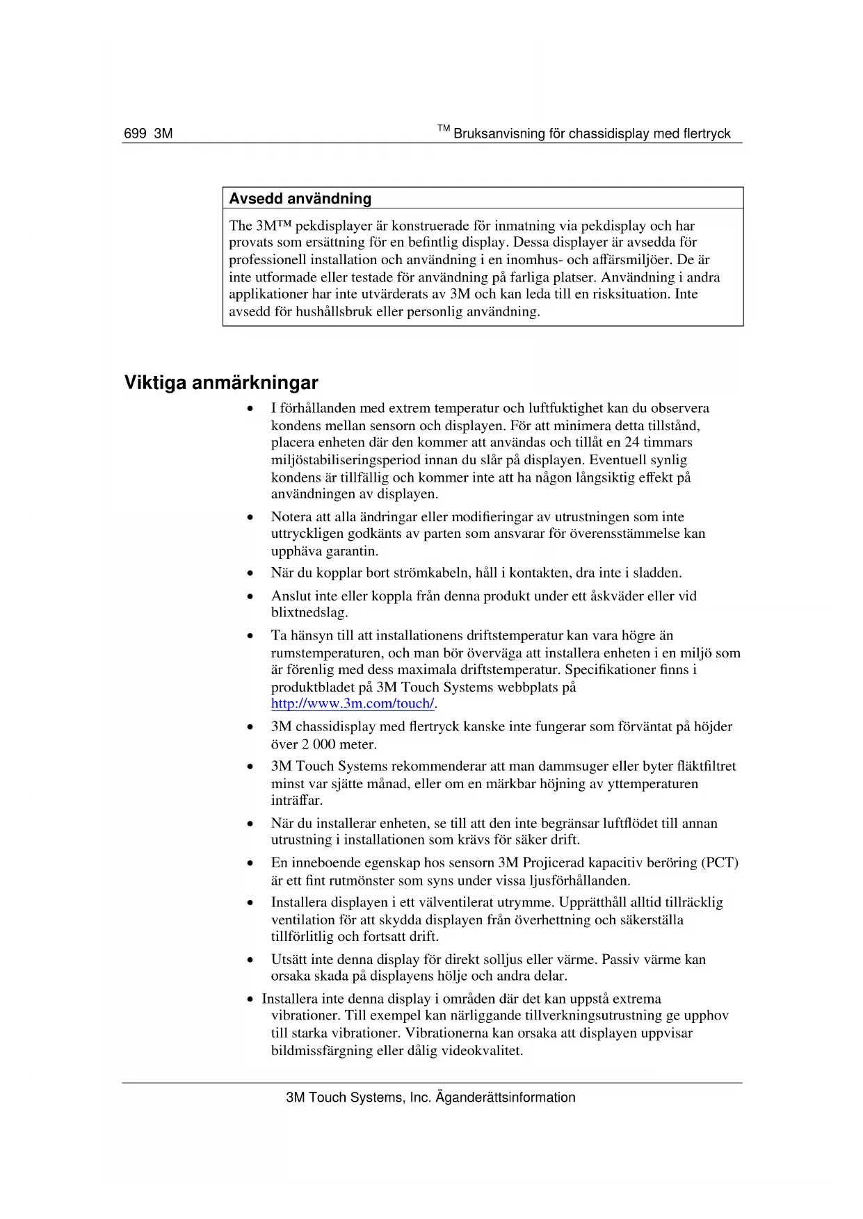 Bruksanvisning för chassidisplay med flertryck 3M Touch Systems, Inc. Äganderättsinformation Avsedd användning The 3M™ pekdisplayer är konstruerade för inmatning via pekdisplay och har provats som ersättning för en befintlig display. Dessa displayer är avsedda för professionell installation och användning i en inomhus- och affärsmiljöer. De är inte utformade eller testade för användning på farliga platser. Användning i andra applikationer har inte utvärderats av 3M och kan leda till en risksituation. Inte avsedd för hushållsbruk eller personlig användning.