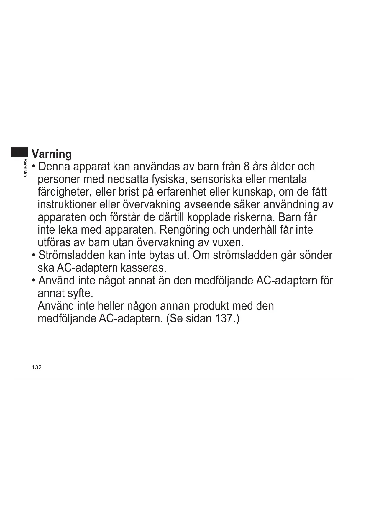 Använd inte heller nagoon annan produkt med den medfoljande AC-adaptern. (Se sidan 137.) -