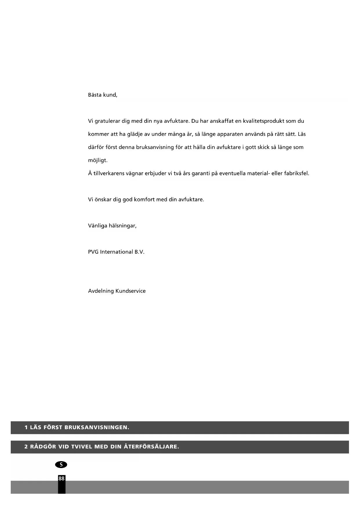 Bästa kund, Vi gratulerar dig med din nya avfuktare. Du har anskaffat en kvalitetsprodukt som du kommer att ha glädje av under många år, så länge apparaten används på rätt sätt. Läs därför först denna bruksanvisning för att hålla din avfuktare i gott skick så länge som möjligt. Å tillverkarens vägnar erbjuder vi två års garanti på eventuella material- eller fabriksfel. Vi önskar dig god komfort med din avfuktare. Vänliga hälsningar, PVG International B.V. Avdelning KundserviceV IKTIGA KOMPONENTER Signallampor Ställknapp/ hygrostat Utsläpp för torr luft Löstagbar vattenreservoar Intag för fuktig luft Luftfilter Avloppspip (ø 13 mm) med stopp Sladd med nätkontakt Handtag
