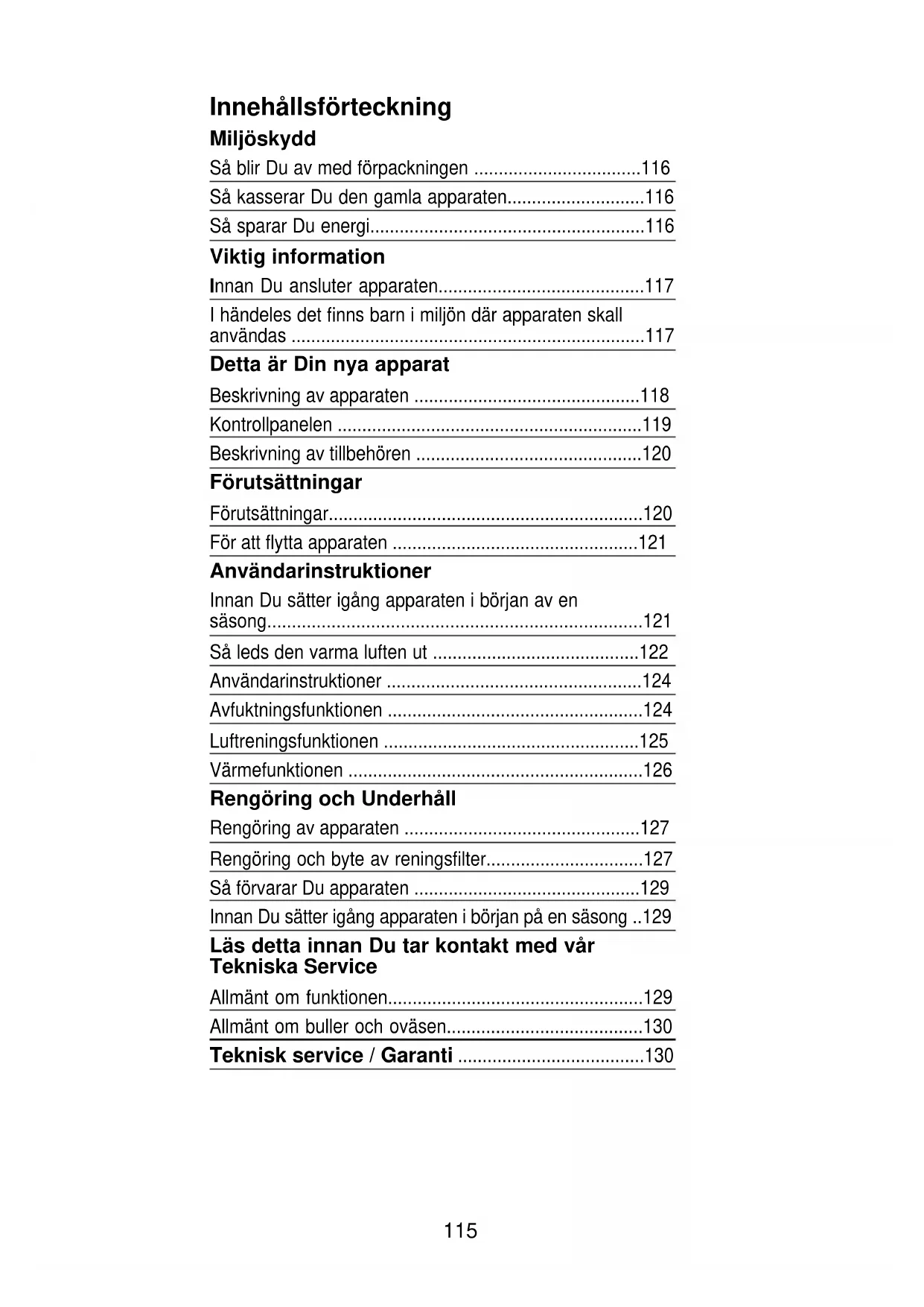 Miljöskydd Så blir Du av med förpackningen ❏ Visa respekt för miljön när Du kastar apparatens förpackning ❏ Våra produkter är speciellt förpackade för att tåla transport. Allt material i förpackningarna är miljövänligt (kartongerna framställs av återvunnet papper) och kan återanvändas. ❏ Genom att återanvända förpackningen hjälper vi, å ena sidan, till med att hålla nere förbrukningen av råmaterial och, å andra, sidan förhindrar vi att soptipparna växer. ❏ Du kan effektivt medverka till att skydda miljön genom att behandla förpackningen på rätt sätt; lämna den till närmaste sopstation eller uppsamlingsplats eller, om det är möjligt, lämna tillbaka den till den återförsäljare Du köpt apparaten av. Så kasserar Du den gamla apparaten ❏ Dra sladden ur vägguttaget och klipp sedan av den. ❏ Den gamla apparaten innehåller både material som kan återvinnas och ma-terial som är skadligt (t.ex. tungmetaller eller frysmedel) och som kan förorena både marken och atmosfären. Du kan, aktivt, medverka till att miljön skyddas ge-nom att se till att Din gamla apparat skrotas på ett sätt som respekterar miljön. Lämna Din gamla apparat på närmaste återvinningsstation (kommunen kan ge Dig upplysningar om var en så-dan finns). Gamla apparater innehåller frysmedel som måste tas om hand på rätt sätt och i enlighet med gällande normer. ❏ Denna enhet är märkt i enlighet med der europeiska direktivet 2002/96/EG om avfall som utgörs av eller innehåller elektroniska produkter (waste electrical and electronic equipment - WEEE). Direktivet anger ramarna för inom EU giltigt återtagande och korrekt återvinning av uttjänta enheter. Så sparar Du energi När Du använder apparaten förbrukar den energi vilket i sin tur påverkar vår miljö. Försök att förbättra apparatens effektivitet för att genom detta minska energiförbrukningen. ❏ Stäng av luftkonditioneringen när Du inte behöver den. ❏ Välj lagom temperatur, alltför låga temperaturer medför en hög energiförbrukning. ❏ Ställ apparaten så långt som möjligt från värmekällor (direkt solsken, etc.) och där luftcirkulationen är god. ❏ Försäkra Dig om att installationen av apparaten är riktigt utförd. När det gäller en luftkonditioneringsapparat kan energiförbrukningen sänkas med upp till 30% genom att tillförseln av värme till lokalen minskas genom att låta markiser, persienner eller gar-diner skydda de glasytor som släpper in värme. ❏ Använd apparatens tillbehör och följ anvisningarna som finns upptagna i det kapitel som beskriver tillbehören för att i mesta möjliga mån förhindra att varm luft tränger in i lokalen. ❏ I de fall där användandet av ett tillbehör kräver att Du måste borra hål i väggar eller fönster så bör dessa hål inte göras större än absolut nödvändigt och alla eventuella springor mellan tillbehöret och väggen/fönstret täppas till med gips, silikon, eller liknande, för att undvika att luft strömmar ut/in genom dessa springor. ❏ För att undvika att apparatens effektivitet minskas – vilket innebär att energiförbrukningen ökar - bör Du följa tillverkarens rekommendationer angående117117 Fig. 1 installationen av det rör som för ut den varma luften. ❏ Undvik att böja röret alltför kraftigt och/eller att använda ett alltför långt rör. ❏ Om Du installerar röret för avluftning i ett skjutfönster, eller i en skjutdörr, bör Du använda det specialtillbehör som förhindrar att varm luft utifrån tränger in i lokalen; om Du gör det fungerar apparaten mer effektivt. ❏ Kontrollera att kopplingshylsorna mellan röret som leder ut varmluften och apparaten och/eller röret och luftspridaren sitter rätt. (se kapitlet som behandlar rengöring och underhåll). ❏ Kontrollera att luftspridaren har installerats på så sätt att fönstret kan stängas så mycket som möjligt för att på så vis undvika att varm luft utifrån tränger in i lokalen. ❏ Försäkra Dig om att luftintag och luftutgångar inte är tilltäppta. Håll dem alltid rena från smuts, damm och främmande föremål. ❏ Försäkra Dig om att apparatens alla filter är rena och korrekt installerade (se kapitlet som behandlar rengöring och underhåll). ❏ Under sommaren bör Du vädra lokalerna under den tid på dygnet då luften utomhus är svalast (tidigt på morgonen och under natten). Viktig information Innan Du ansluter apparaten ❏ Läs instruktionshandboken innan Du använder apparaten för första gången. I den hittar Du viktig information angående Din nya luftkonditioneringsapparat, inte bara när det gäller hur den skall användas utan också när det gäller säkerhet och underhåll. ❏ Spara denna instruktionshandbok. Det kan hända att någon annan behöver den vid ett senare tillfälle. ❏ Sätt aldrig på en apparat som på något sätt har blivit skadad. ❏ Monteringen och installationen av Din apparat bör göras både i enlighet med monteringsanvisningarna och med gällande normer. Om dessa instruktioner inte följs kan det hända att apparatens garanti blir ogiltig. ❏ Våra apparater är tillverkade i enlighet med gällande säkerhetsnormer. De får bara repareras av teknisk personal som är specialutbildad. Tänk på att Din egen säkerhet beror på hur apparaten lagas. ❏ Försäkra Dig om att proppen för på dräneringsröret sitter ordentligt fast – den kan ha lossnat under transporten, Bild 1. ❏ Observera att dessa apparater enbart är ägnade att användas i hemmiljöer eller affärslokaler av mindre storlek. ❏ Om apparaten används i industrimiljöer, dvs. i stora lokaler eller i närheten av industriella värmekällor (motstånd, värmeugnar, etc.), gäller inte tillverkarens garanti. I händeles det finns barn i miljön där apparaten skall användas ❏ Låt inte barnet sätta sig, eller klättra upp, på luftkonditioneringsapparaten och inte heller klänga p