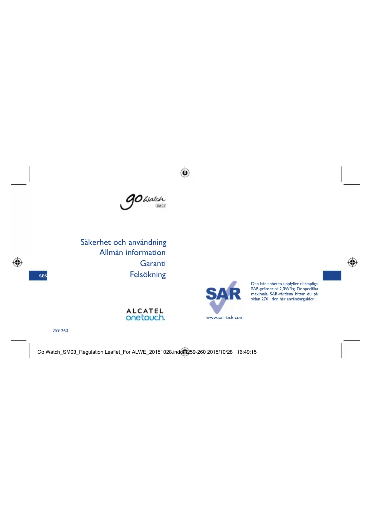 Säkerhet och användning Allmän information Garanti Felsökning www.sar-tick.com Den här enheten uppfyller tillämpliga SAR-gränser på 2,0W/kg. De specifika maximala SAR-värdena hittar du på sidan 276 i den här användarguiden. Go Watch_SM03_Regulation Leaflet_For ALWE_20151028.indd 259-260 2015/10/28 16:49:15SE SE
