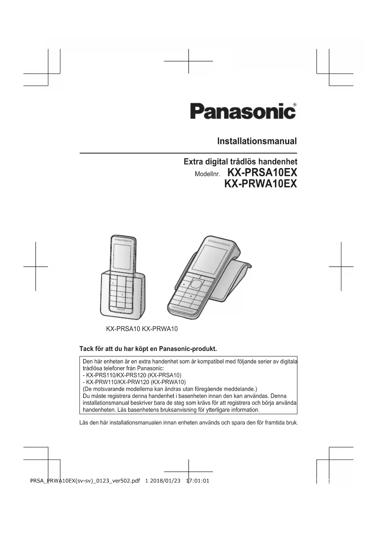Installatie PRSA_PRWA10EX(nl-nl)_0123_ver502.pdf 8 2018/01/23 17:46:01Installationsmanual Extra digital trådlös handenhet Modellnr. KX-PRSA10EX KX-PRWA10EX KX-PRSA10 KX-PRWA10 Tack för att du har köpt en Panasonic-produkt. Den här enheten är en extra handenhet som är kompatibel med följande serier av digitala trådlösa telefoner från Panasonic: - KX-PRS110/KX-PRS120 (KX-PRSA10) - KX-PRW110/KX-PRW120 (KX-PRWA10) (De motsvarande modellerna kan ändras utan föregående meddelande.) Du måste registrera denna handenhet i basenheten innan den kan användas. Denna installationsmanual beskriver bara de steg som krävs för att registrera och börja använda handenheten. Läs basenhetens bruksanvisning för ytterligare information. Läs den här installationsmanualen innan enheten används och spara den för framtida bruk. PRSA_PRWA10EX(sv-sv)_0123_ver502.pdf 1 2018/01/23 17:01:01Information om tillbehör Tillbehör som medföljer Tillbehör/artikelnummer Kvantitet Laddare 1 Nätadapter/PNLV233CE 1 Uppladdningsbara batterier