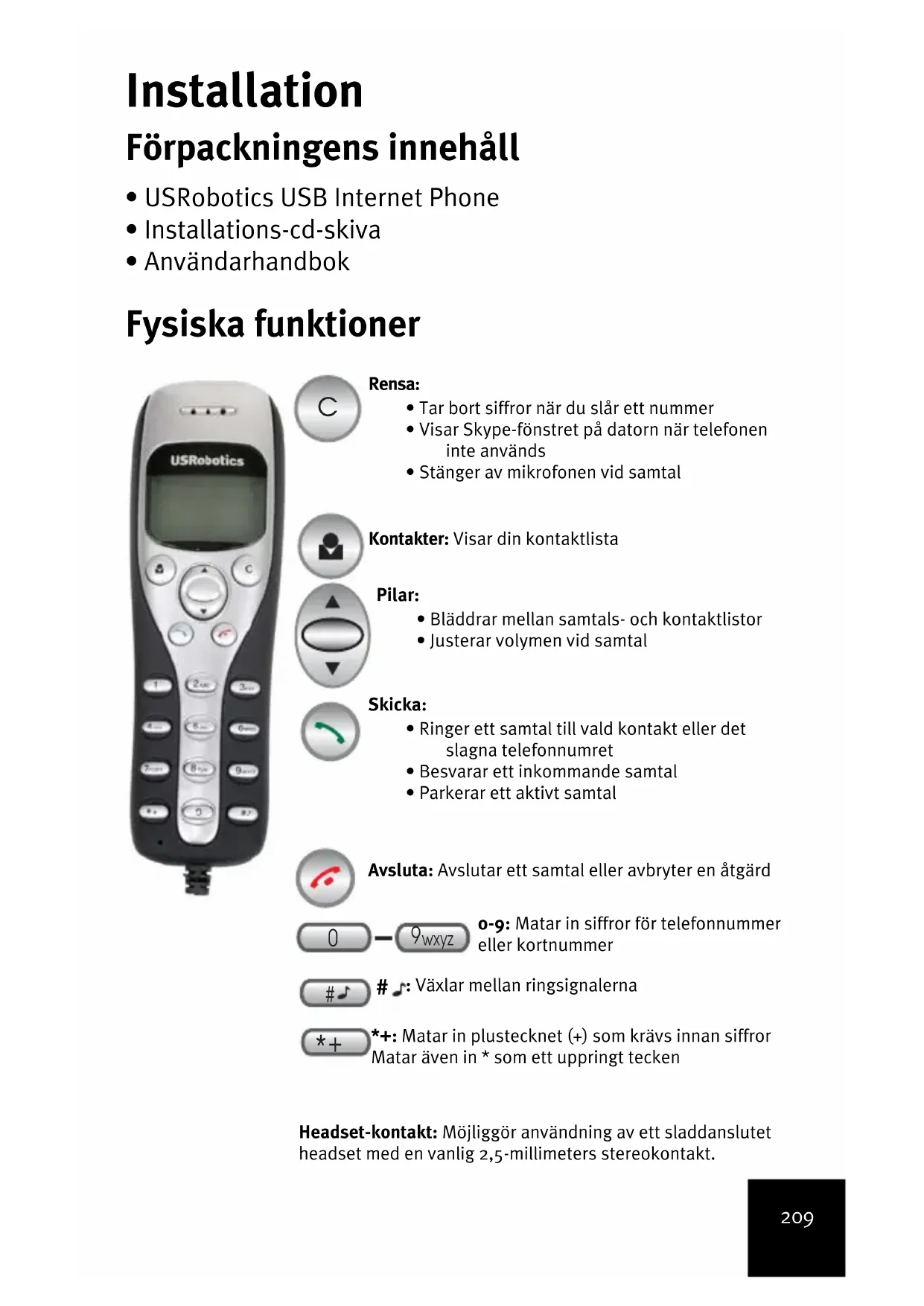 Pilar: • Bläddrar mellan samtals- och kontaktlistor• Justerar volymen vid samtal #210 Systemkrav Om du vill använda USRobotics USB Internet Phone och Skype™-IP- telefonitjänsten måste din dator och kringutrustningen uppfylla följande minimikrav: