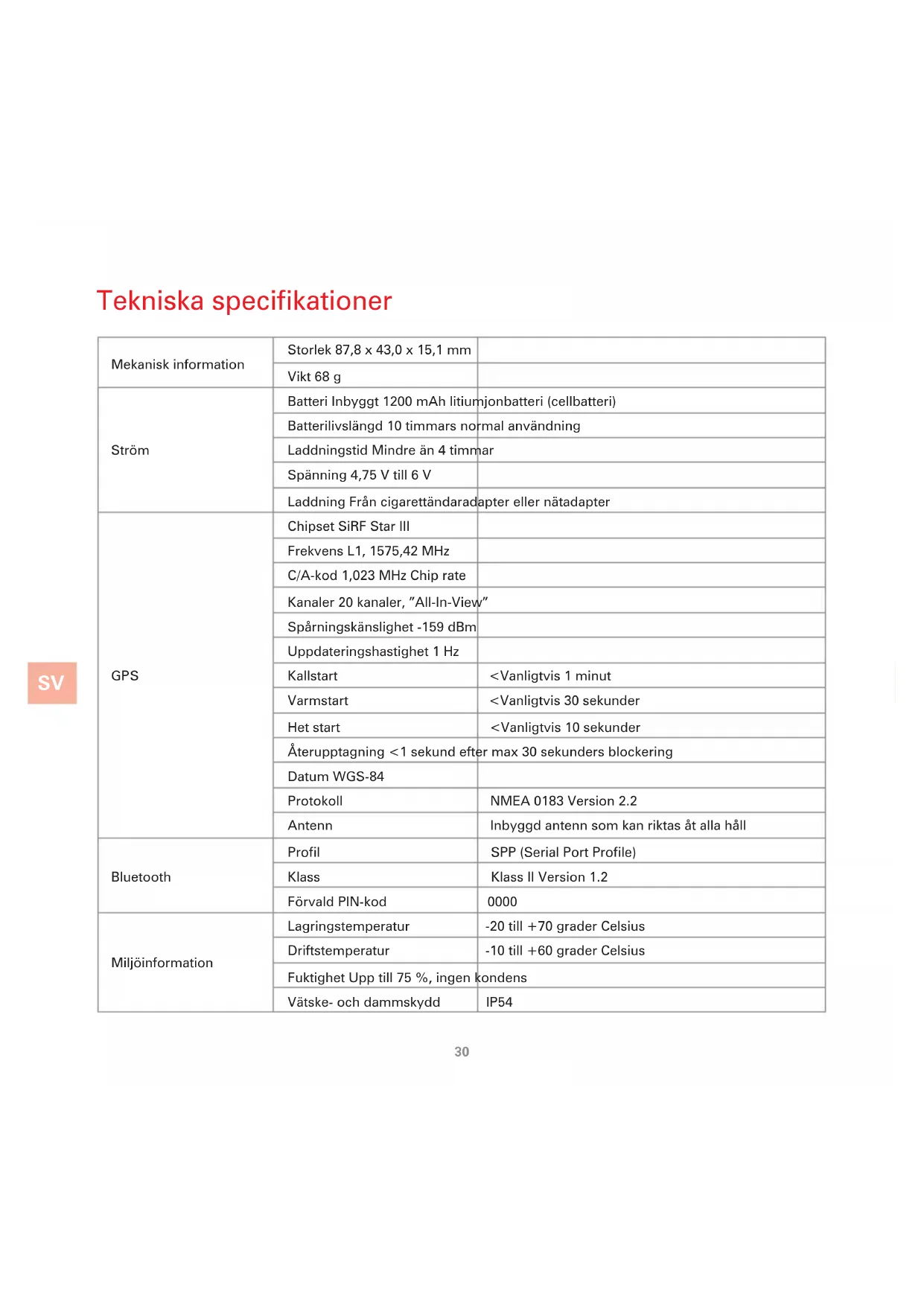 Tekniska specikationer Mekanisk information Storlek 87,8 x 43,0 x 15,1 mm Vikt 68 g Ström Batteri Inbyggt 1200 mAh litiumjonbatteri (cellbatteri) Batterilivslängd 10 timmars normal användning Laddningstid Mindre än 4 timmar Spänning 4,75 V till 6 V Laddning Från cigarettändaradapter eller nätadapter GPS Chipset SiRF Star III Frekvens L1, 1575,42 MHz C/A-kod 1,023 MHz Chip rate Kanaler 20 kanaler, ”All-In-View” Spårningskänslighet -159 dBm Uppdateringshastighet 1 Hz Kallstart <Vanligtvis 1 minut Varmstart <Vanligtvis 30 sekunder Het start <Vanligtvis 10 sekunder Återupptagning <1 sekund efter max 30 sekunders blockering Datum WGS-84 Protokoll NMEA 0183 Version 2.2 Antenn Inbyggd antenn som kan riktas åt alla håll Bluetooth Prol SPP (Serial Port Prole) Klass Klass II Version 1.2 Förvald PIN-kod 0000 Miljöinformation Lagringstemperatur -20 till +70 grader Celsius Driftstemperatur -10 till +60 grader Celsius Fuktighet Upp till 75 %, ingen kondens Vätske- och dammskydd IP5430