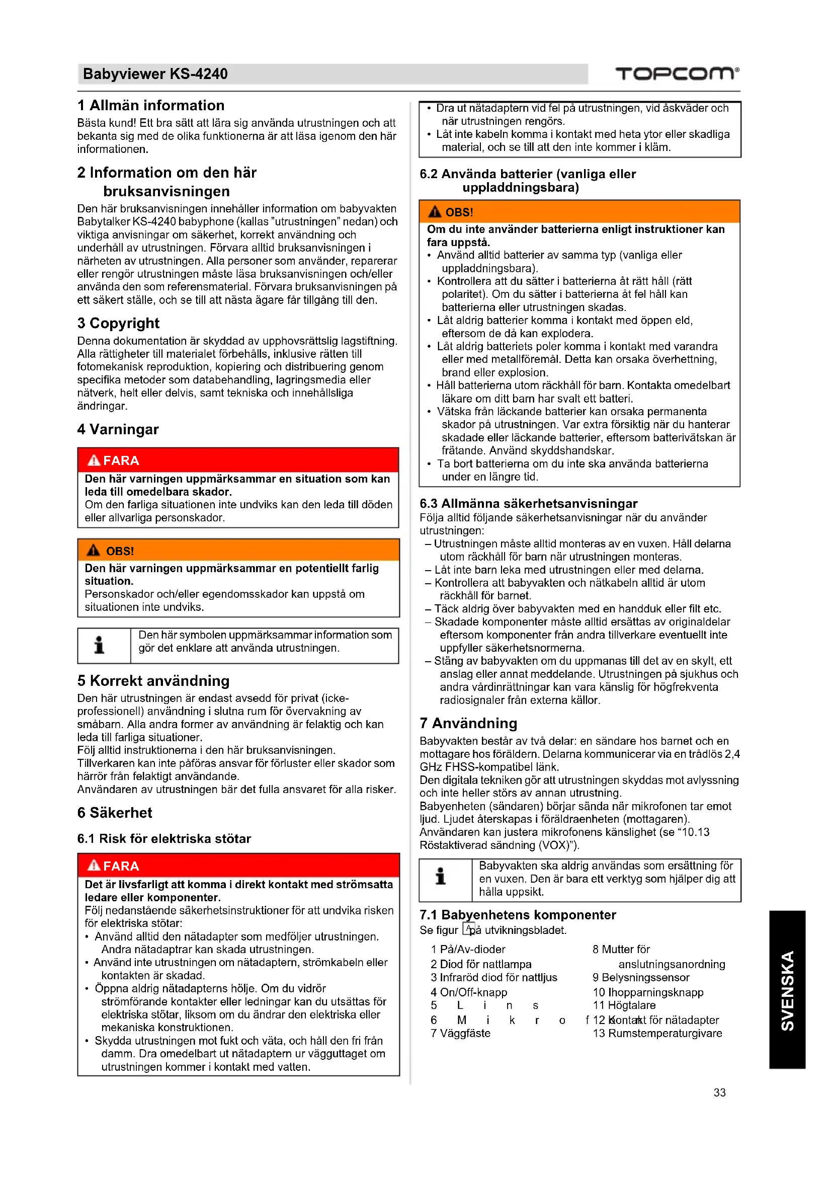 SVENSKA 1 Allmän information Bästa kund! Ett bra sätt att lära sig använda utrustningen och att bekanta sig med de olika funktionerna är att läsa igenom den här informationen. 2 Information om den här bruksanvisningen Den här bruksanvisningen innehåller information om babyvakten Babytalker KS-4240 babyphone (kallas ”utrustningen” nedan) och viktiga anvisningar om säkerhet, korrekt användning och underhåll av utrustningen. Förvara alltid bruksanvisningen i närheten av utrustningen. Alla personer som använder, reparerar eller rengör utrustningen måste läsa bruksanvisningen och/eller använda den som referensmaterial. Förvara bruksanvisningen på ett säkert ställe, och se till att nästa ägare får tillgång till den. 3 Copyright Denna dokumentation är skyddad av upphovsrättslig lagstiftning.Alla rättigheter till materialet förbehålls, inklusive rätten till fotomekanisk reproduktion, kopiering och distribuering genom specifika metoder som databehandling, lagringsmedia eller nätverk, helt eller delvis, samt tekniska och innehållsliga ändringar. 4 Varningar 5 Korrekt användning Den här utrustningen är endast avsedd för privat (icke-professionell) användning i slutna rum för övervakning av småbarn. Alla andra former av användning är felaktig och kan leda till farliga situationer.Följ alltid instruktionerna i den här bruksanvisningen.Tillverkaren kan inte påföras ansvar för förluster eller skador som härrör från felaktigt användande.Användaren av utrustningen bär det fulla ansvaret för alla risker. 6 Säkerhet