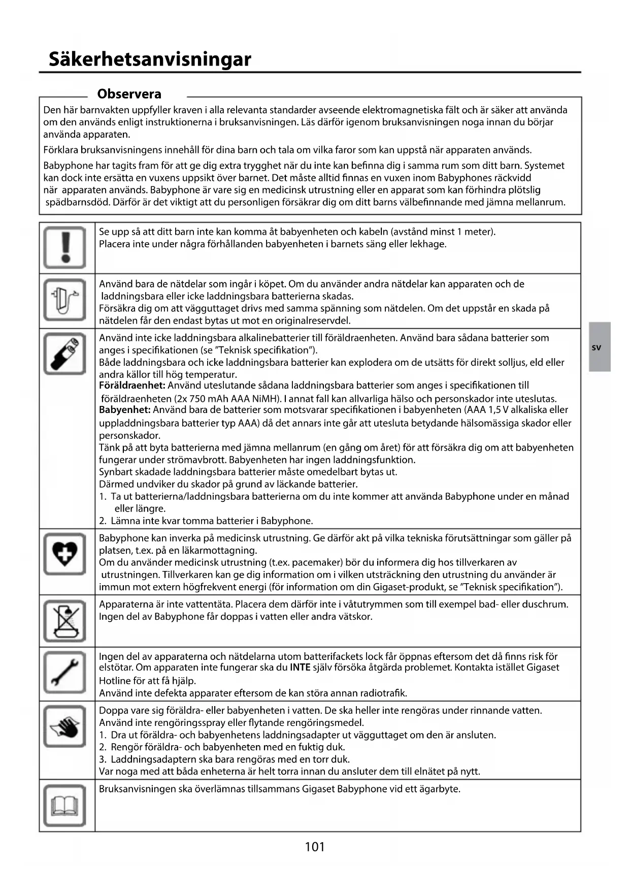 Babyphone kan inverka på medicinsk utrustning. Ge därför akt på vilka tekniska förutsättningar som gäller på platsen, t.ex. på en läkarmottagning. Om du använder medicinsk utrustning (t.ex. pacemaker) bör du informera dig hos tillverkaren av utrustningen. Tillverkaren kan ge dig information om i vilken utsträckning den utrustning du använder är immun mot extern högfrekvent energi (för information om din Gigaset-produkt, se ”Teknisk specikation”). Apparaterna är inte vattentäta. Placera dem därför inte i våtutrymmen som till exempel bad- eller duschrum. Ingen del av Babyphone får doppas i vatten eller andra vätskor. Ingen del av apparaterna och nätdelarna utom batterifackets lock får öppnas eftersom det då nns risk för elstötar. Om apparaten inte fungerar ska du INTE själv försöka åtgärda problemet. Kontakta istället Gigaset Hotline för att få hjälp. Använd inte defekta apparater eftersom de kan störa annan radiotrak. Doppa vare sig föräldra- eller babyenheten i vatten. De ska heller inte rengöras under rinnande vatten. Använd inte rengöringsspray eller ytande rengöringsmedel.