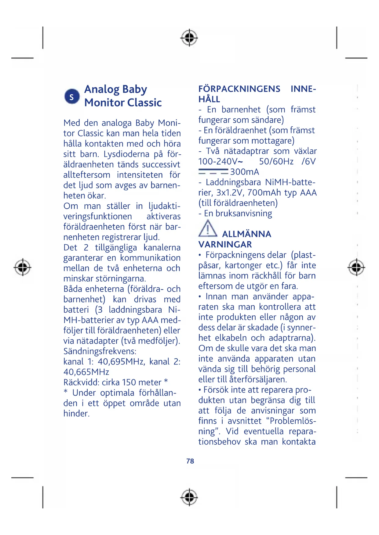 RANTIN UPPHÖR ATT GÄLLA. Inställning och egenskaper Övervakningsapparaten med analog teknik för sändning kan användas som hjälpmedel vid övervakning av barn i hemmet. Denna babymonitor omfattar en barnenhet (sändare) och en föräldraenhet (mottagare). Både apparater använder ana- log teknik för sändning för att etablera en radioanslutning som tillåter sändning och mot- tagning av ljud.