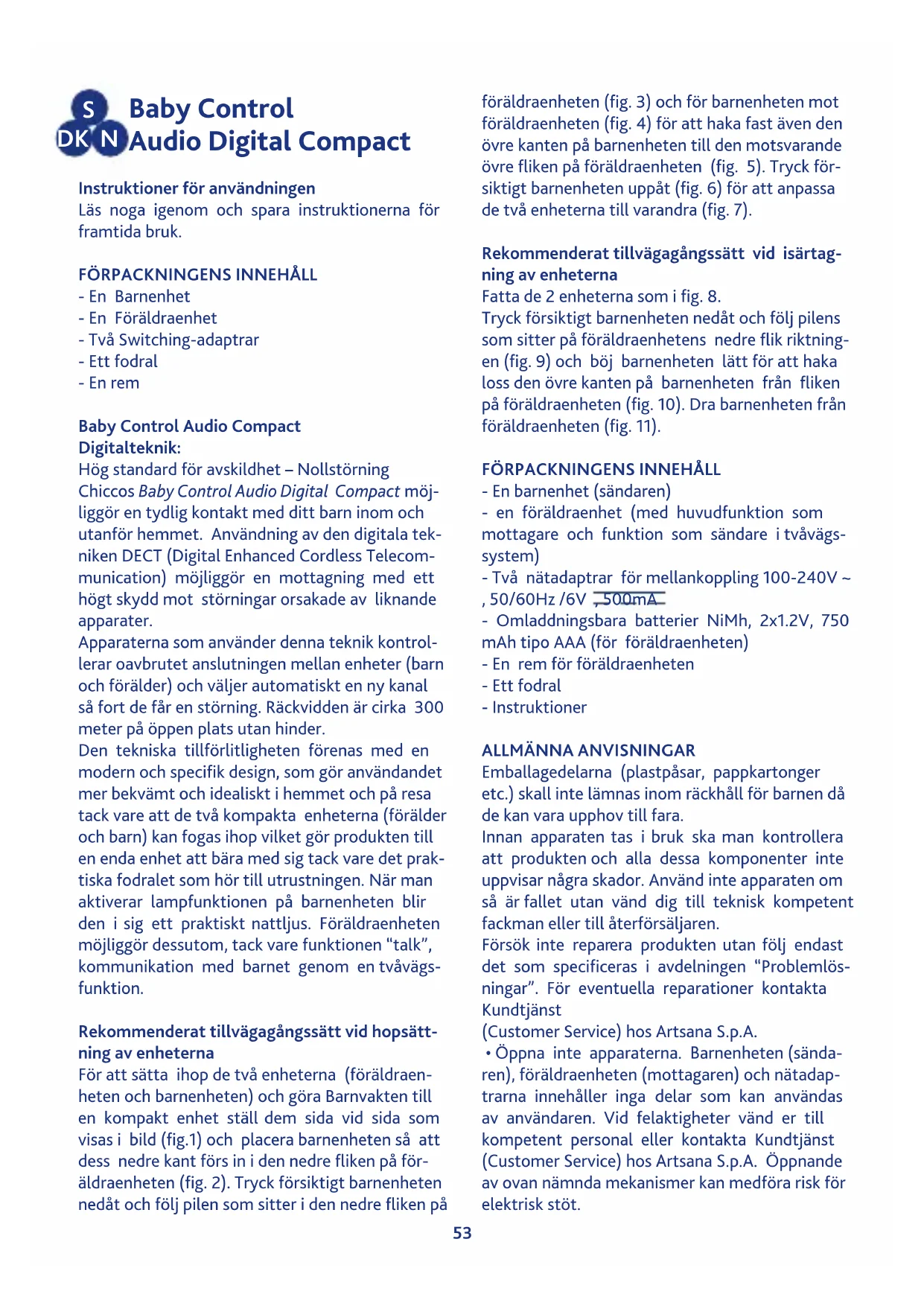 - En Barnenhet - En Föräldraenhet - Två Switching-adaptrar - Ett fodral - En rem Baby Control Audio Compact Digitalteknik: Hög standard för avskildhet – Nollstörning Chiccos Baby Control Audio Digital Compact möj- liggör en tydlig kontakt med ditt barn inom och utanför hemmet. Användning av den digitala tek- niken DECT (Digital Enhanced Cordless Telecom- munication) möjliggör en mottagning med ett högt skydd mot störningar orsakade av liknande apparater. Apparaterna som använder denna teknik kontrol- lerar oavbrutet anslutningen mellan enheter (barn och förälder) och väljer automatiskt en ny kanal så fort de får en störning. Räckvidden är cirka 300 meter på öppen plats utan hinder. Den tekniska tillförlitligheten förenas med en modern och specifik design, som gör användandet mer bekvämt och idealiskt i hemmet och på resa tack vare att de två kompakta enheterna (förälder och barn) kan fogas ihop vilket gör produkten till en enda enhet att bära med sig tack vare det prak- tiska fodralet som hör till utrustningen. När man aktiverar lampfunktionen på barnenheten blir den i sig ett praktiskt nattljus. Föräldraenheten möjliggör dessutom, tack vare funktionen “talk”, kommunikation med barnet genom en tvåvägs- funktion. Rekommenderat tillvägagångssätt vid hopsätt- ning av enheterna För att sätta ihop de två enheterna (föräldraen- heten och barnenheten) och göra Barnvakten till en kompakt enhet ställ dem sida vid sida som visas i bild (fig.1) och placera barnenheten så att dess nedre kant förs in i den nedre fliken på för- äldraenheten (fig. 2). Tryck försiktigt barnenheten nedåt och följ pilen som sitter i den nedre fliken på föräldraenheten (fig. 3) och för barnenheten mot föräldraenheten (fig. 4) för att haka fast även den övre kanten på barnenheten till den motsvarande övre fliken på föräldraenheten (fig. 5). Tryck för- siktigt barnenheten uppåt (fig. 6) för att anpassa de två enheterna till varandra (fig. 7). Rekommenderat tillvägagångssätt vid isärtag- ning av enheterna Fatta de 2 enheterna som i fig. 8. Tryck försiktigt barnenheten nedåt och följ pilens som sitter på föräldraenhetens nedre flik riktning- en (fig. 9) och böj barnenheten lätt för att haka loss den övre kanten på barnenheten från fliken på föräldraenheten (fig. 10). Dra barnenheten från föräldraenheten (fig. 11).