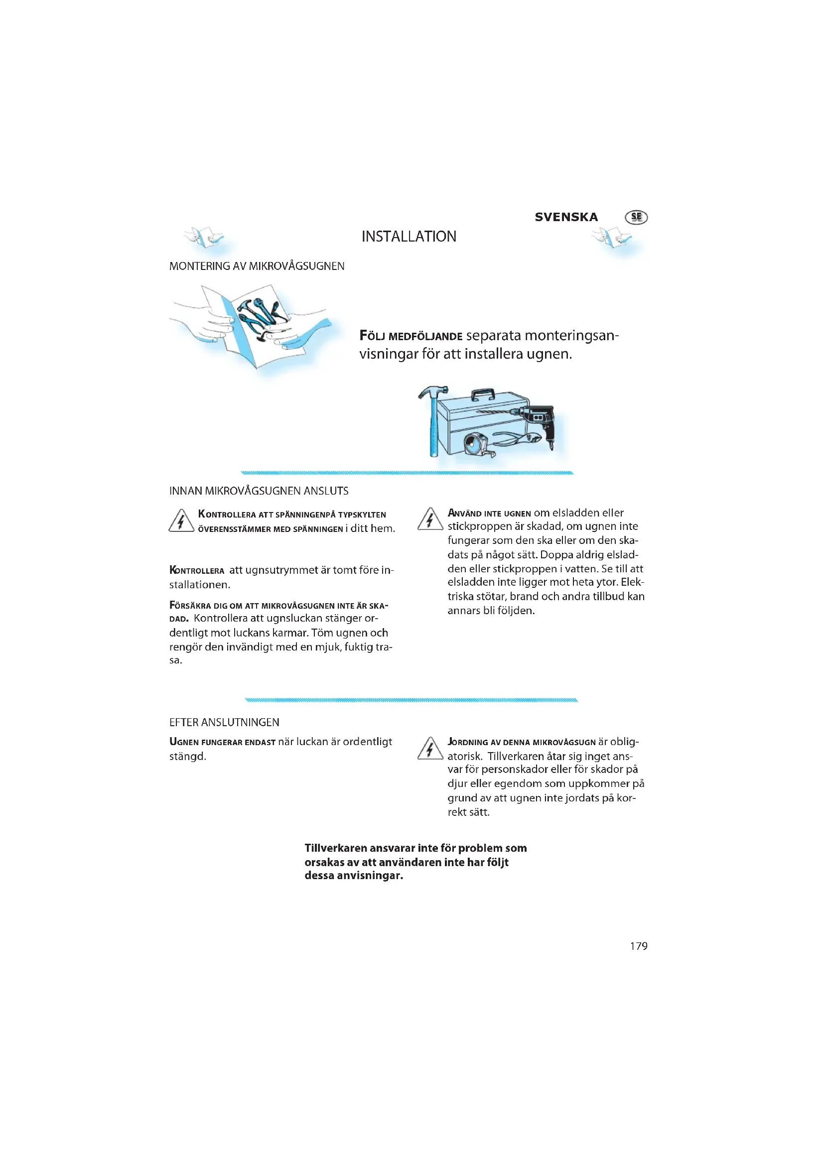 ORDNING AV DENNA MIKROVÅGSUGN är oblig- atorisk. Tillverkaren åtar sig inget ans- var för personskador eller för skador på djur eller egendom som uppkommer på grund av att ugnen inte jordats på kor- rekt sätt. Tillverkaren ansvarar inte för problem som orsakas av att användaren inte har följt dessa anvisningar.
