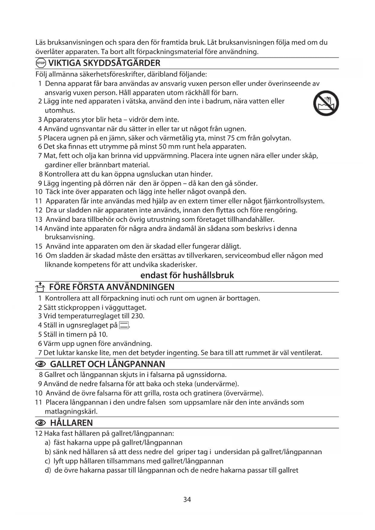 Följ allmänna säkerhetsföreskrifter, däribland följande: 1 Denna apparat får bara användas av ansvarig vuxen person eller under överinseende av ansvarig vuxen person. Håll apparaten utom räckhåll för barn. 2 Lägg inte ned apparaten i vätska, använd den inte i badrum, nära vatten eller utomhus. 3 Apparatens ytor blir heta – vidrör dem inte. 4 Använd ugnsvantar när du sätter in eller tar ut något från ugnen. 5 Placera ugnen på en jämn, säker och värmetålig yta, minst 75 cm från golvytan. 6 Det ska finnas ett utrymme på minst 50 mm runt hela apparaten. 7 Mat, fett och olja kan brinna vid uppvärmning. Placera inte ugnen nära eller under skåp, gardiner eller brännbart material. 8 Kontrollera att du kan öppna ugnsluckan utan hinder. 9 Lägg ingenting på dörren när den är öppen – då kan den gå sönder. 10 Täck inte över apparaten och lägg inte heller något ovanpå den. 11 Apparaten får inte användas med hjälp av en extern timer eller något ärrkontrollsystem. 12 Dra ur sladden när apparaten inte används, innan den flyttas och före rengöring. 13 Använd bara tillbehör och övrig utrustning som företaget tillhandahåller. 14 Använd inte apparaten för några andra ändamål än sådana som beskrivs i denna bruksanvisning. 15 Använd inte apparaten om den är skadad eller fungerar dåligt. 16 Om sladden är skadad måste den ersättas av tillverkaren, serviceombud eller någon med liknande kompetens för att undvika skaderisker. endast för hushållsbruk U FÖRE FÖRSTA ANVÄNDNINGEN 1 Kontrollera att all förpackning inuti och runt om ugnen är borttagen. 2 Sätt stickproppen i vägguttaget. 3 Vrid temperaturreglaget till 230. 4 Ställ in ugnsreglaget på H. 5 Ställ in timern på 10. 6 Värm upp ugnen före användning. 7 Det luktar kanske lite, men det betyder ingenting. Se bara till att rummet är väl ventilerat.