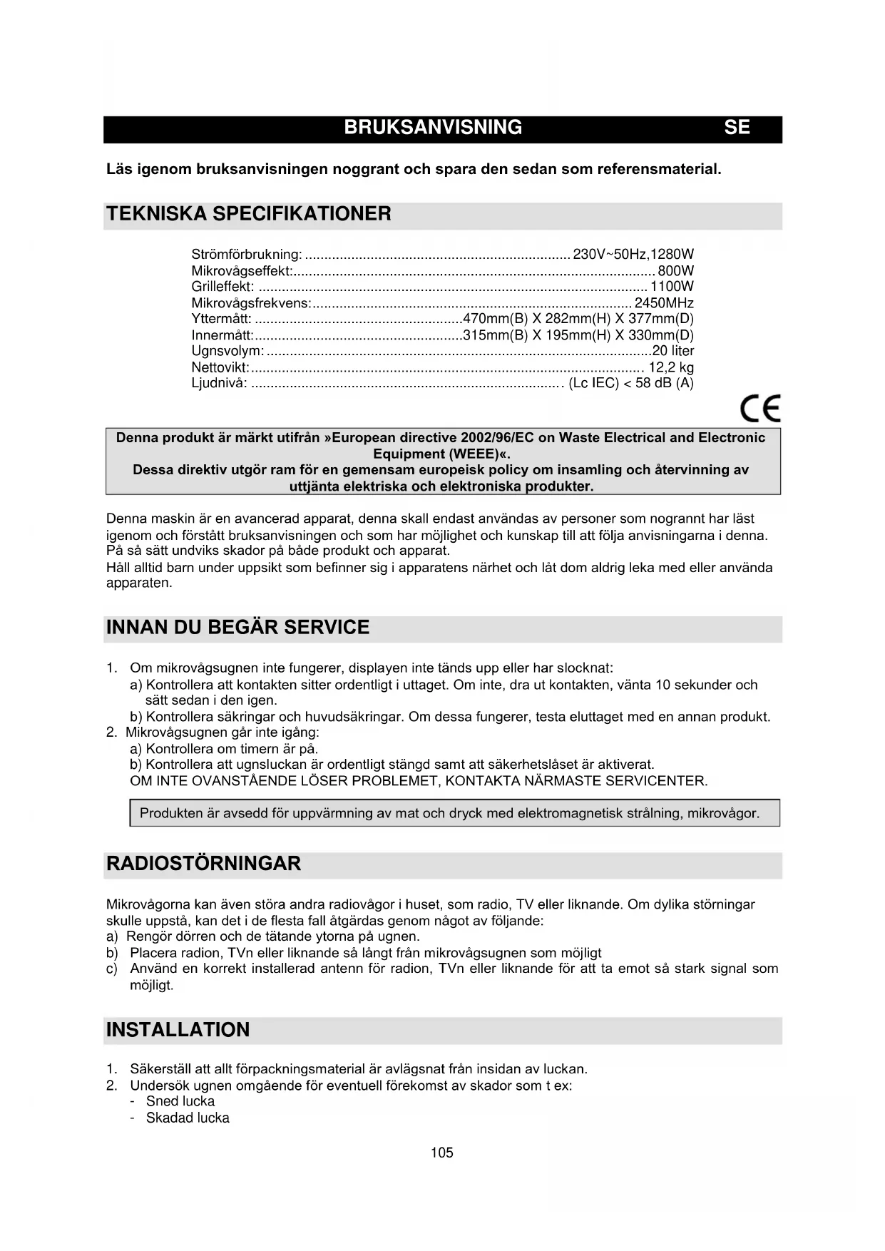 Yderligere anbefalinger om madlavning med mikrobølgeovn og grill og andre nyttige tips kan du finde på hjemmesiden: htpp://www.gorenje.com105 BRUKSANVISNING SE Läs igenom bruksanvisningen noggrant och spara den sedan som referensmaterial. TEKNISKA SPECIFIKATIONER Strömförbrukning: ..................................................................... 230V~50Hz,1280W Mikrovågseffekt:.............................................................................................. 800W Grilleffekt: ..................................................................................................... 1100W Mikrovågsfrekvens: ................................................................................... 2450MHz Yttermått: ...................................................... 470mm(B) X 282mm(H) X 377mm(D) Innermått: ...................................................... 315mm(B) X 195mm(H) X 330mm(D) Ugnsvolym: .................................................................................................... 20 liter Nettovikt: ..................................................................................................... . 12,2 kg Ljudnivå: ................................................................................ . (Lc IEC) < 58 dB (A) Denna produkt är märkt utifrån »European directive 2002/96/EC on Waste Electrical and Electronic Equipment (WEEE)«. Dessa direktiv utgör ram för en gemensam europeisk policy om insamling och återvinning av uttjänta elektriska och elektroniska produkter. Denna maskin är en avancerad apparat, denna skall endast användas av personer som nogrannt har läst igenom och förstått bruksanvisningen och som har möjlighet och kunskap till att följa anvisningarna i denna. På så sätt undviks skador på både produkt och apparat. Håll alltid barn under uppsikt som befinner sig i apparatens närhet och låt dom aldrig leka med eller använda apparaten.