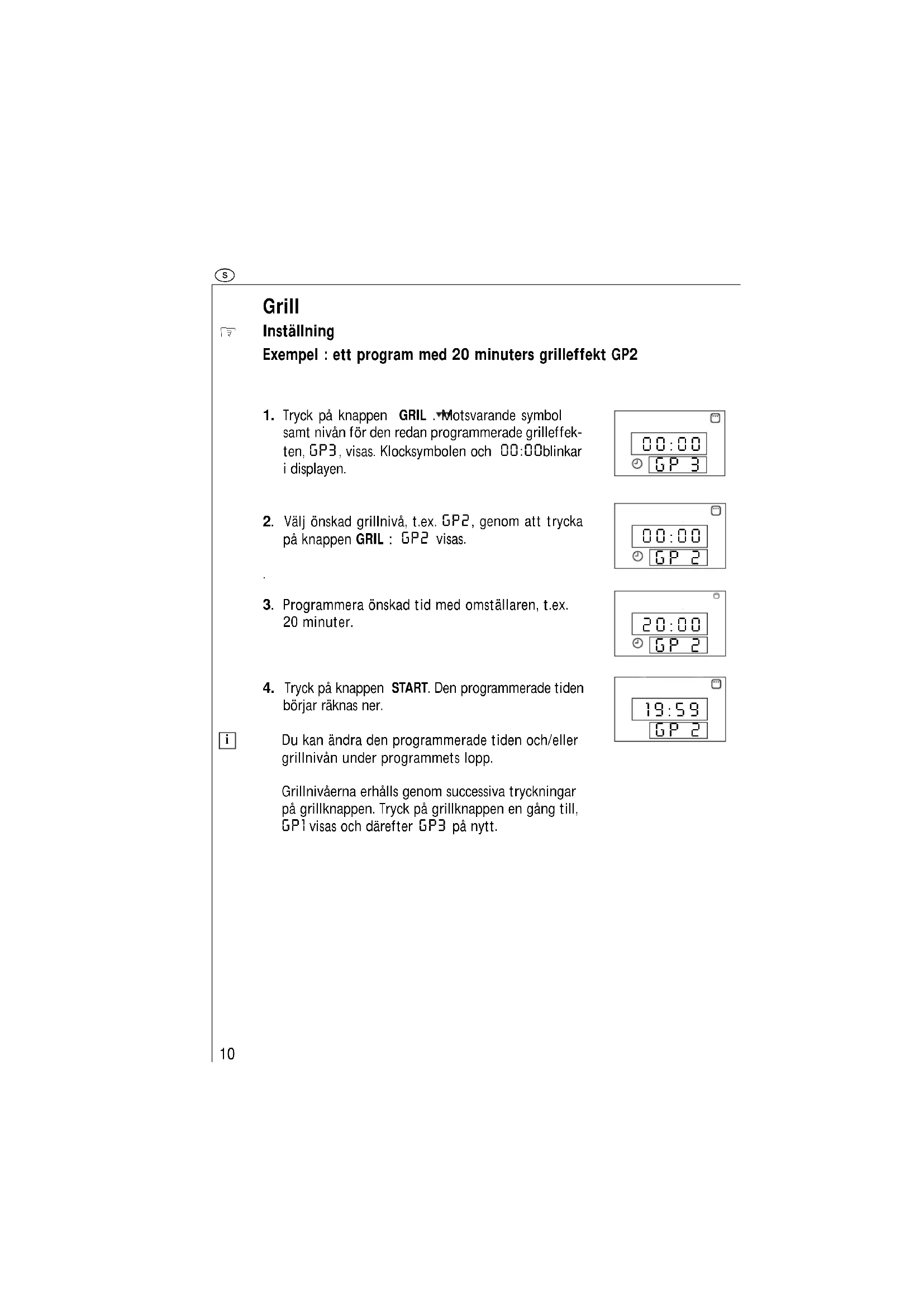 Grillnivaerna erhälts genom successiva tryckninger pa grillknappen. Tryck pa grillknappen en gang till, GP1 visas och darefter GP3 pa nytt.