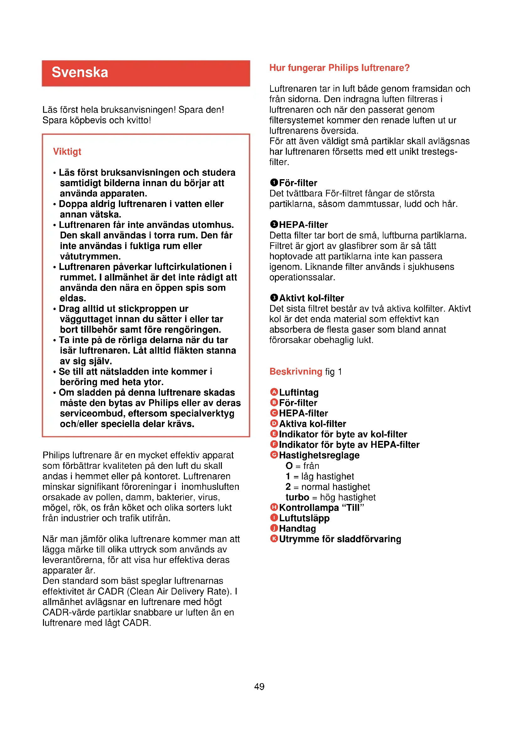 - Om sladden på denna luftrenare skadas måste den bytas av Philips eller av deras serviceombud, eftersom specialverktyg och/eller speciella delar krävs. Hur fungerar Philips luftrenare? Luftrenaren tar in luft både genom framsidan och från sidorna. Den indragna luften filtreras i luftrenaren och när den passerat genom filtersystemet kommer den renade luften ut ur luftrenarens översida. För att även väldigt små partiklar skall avlägsnas har luftrenaren försetts med ett unikt trestegs- filter. 1 För-filter Det tvättbara För-filtret fångar de största partiklarna, såsom dammtussar, ludd och hår. 2 HEPA-filter Detta filter tar bort de små, luftburna partiklarna. Filtret är gjort av glasfibrer som är så tätt hoptovade att partiklarna inte kan passera igenom. Liknande filter används i sjukhusens operationssalar. 3 Aktivt kol-filter Det sista filtret består av två aktiva kolfilter. Aktivt kol är det enda material som effektivt kan absorbera de flesta gaser som bland annat förorsakar obehaglig lukt. Beskrivning fig 1 A Luftintag B För-filter C HEPA-filter D Aktiva kol-filter E Indikator för byte av kol-filter F Indikator för byte av HEPA-filter G Hastighetsreglage O = från 1 = låg hastighet 2 = normal hastighet turbo = hög hastighet H Kontrollampa “Till” I Luftutsläpp J Handtag K Utrymme för sladdförvaring Svenska Philips luftrenare är en mycket effektiv apparat som förbättrar kvaliteten på den luft du skall andas i hemmet eller på kontoret. Luftrenaren minskar signifikant föroreningar i inomhusluften orsakade av pollen, damm, bakterier, virus, mögel, rök, os från köket och olika sorters lukt från industrier och trafik utifrån. När man jämför olika luftrenare kommer man att lägga märke till olika uttryck som används av leverantörerna, för att visa hur effektiva deras apparater är. Den standard som bäst speglar luftrenarnas effektivitet är CADR (Clean Air Delivery Rate). I allmänhet avlägsnar en luftrenare med högt CADR-värde partiklar snabbare ur luften än en luftrenare med lågt CADR. Läs först hela bruksanvisningen! Spara den! Spara köpbevis och kvitto!50 Placering