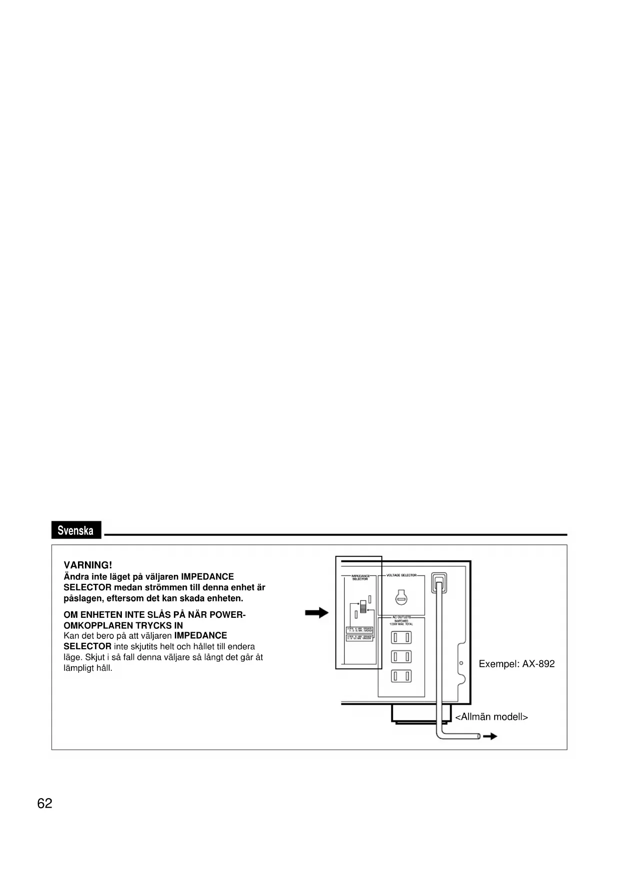 MC69 Svenska VARNING! Ändra inte läget på väljaren IMPEDANCE SELECTOR medan strömmen till denna enhet är påslagen, eftersom det kan skada enheten. OM ENHETEN INTE SLÅS PÅ NÄR POWER-