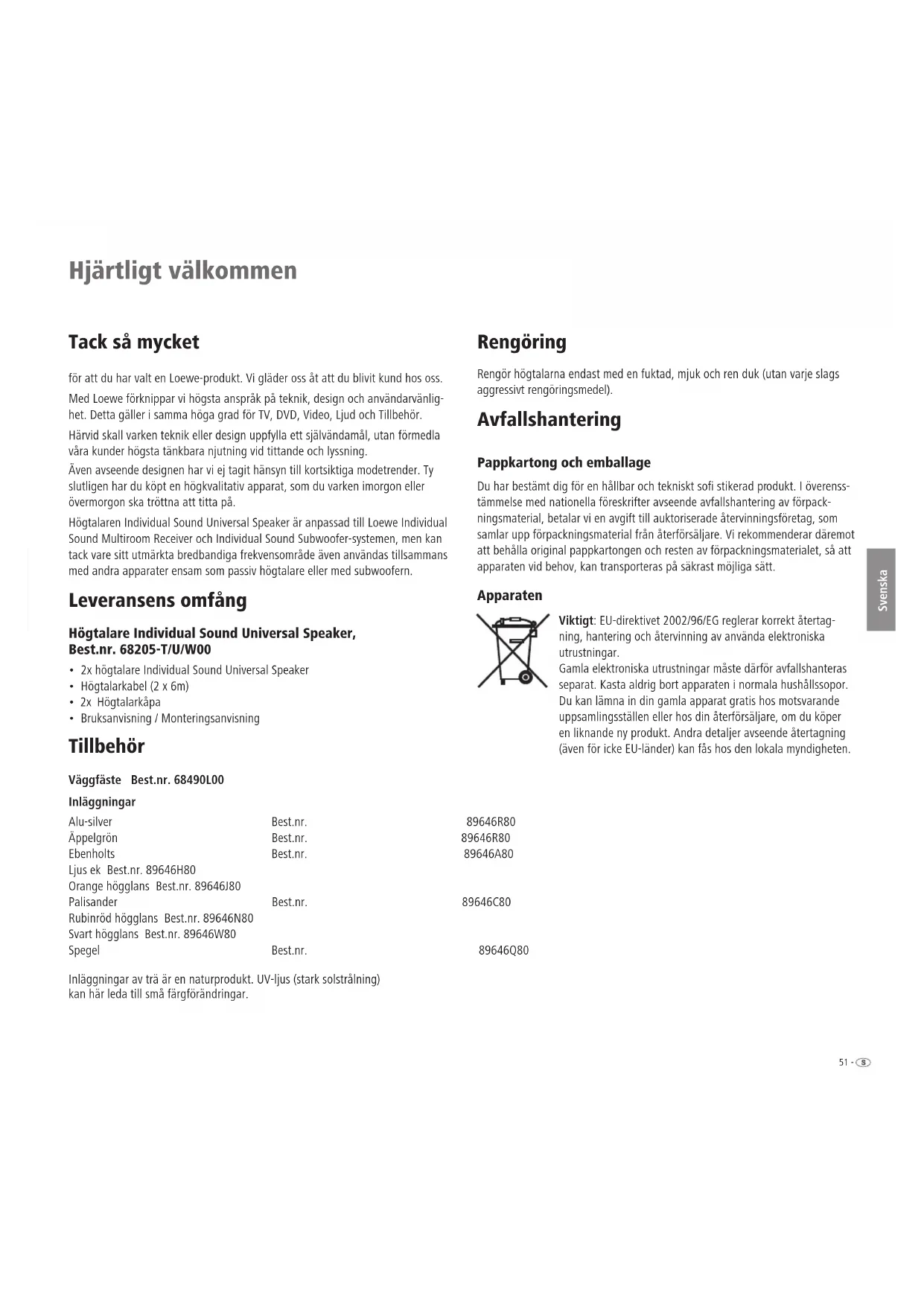 - Bruksanvisning / Monteringsanvisning Tillbehör Väggfäste Best.nr. 68490L00 Inläggningar Alu-silver Best.nr. 89646R80 Äppelgrön Best.nr. 89646R80 Ebenholts Best.nr. 89646A80 Ljus ek Best.nr. 89646H80 Orange högglans Best.nr. 89646J80 Palisander Best.nr. 89646C80 Rubinröd högglans Best.nr. 89646N80 Svart högglans Best.nr. 89646W80 Spegel Best.nr. 89646Q80 Inläggningar av trä är en naturprodukt. UV-ljus (stark solstrålning) kan här leda till små färgförändringar. Rengöring Rengör högtalarna endast med en fuktad, mjuk och ren duk (utan varje slags aggressivt rengöringsmedel). Avfallshantering Pappkartong och emballage Du har bestämt dig för en hållbar och tekniskt sofi stikerad produkt. I överenss- tämmelse med nationella föreskrifter avseende avfallshantering av förpack- ningsmaterial, betalar vi en avgift till auktoriserade återvinningsföretag, som samlar upp förpackningsmaterial från återförsäljare. Vi rekommenderar däremot att behålla original pappkartongen och resten av förpackningsmaterialet, så att apparaten vid behov, kan transporteras på säkrast möjliga sätt. Apparaten Viktigt: EU-direktivet 2002/96/EG reglerar korrekt återtag- ning, hantering och återvinning av använda elektroniska utrustningar. Gamla elektroniska utrustningar måste därför avfallshanteras separat. Kasta aldrig bort apparaten i normala hushållssopor. Du kan lämna in din gamla apparat gratis hos motsvarande uppsamlingsställen eller hos din återförsäljare, om du köper en liknande ny produkt. Andra detaljer avseende återtagning (även för icke EU-länder) kan fås hos den lokala myndigheten.- 52 Svenska För din säkerhet För din egen säkerhet och för att undvika onödiga skador på apparaten, ombe- des du att läsa och beakta följande säkerhetshänvisningar:
