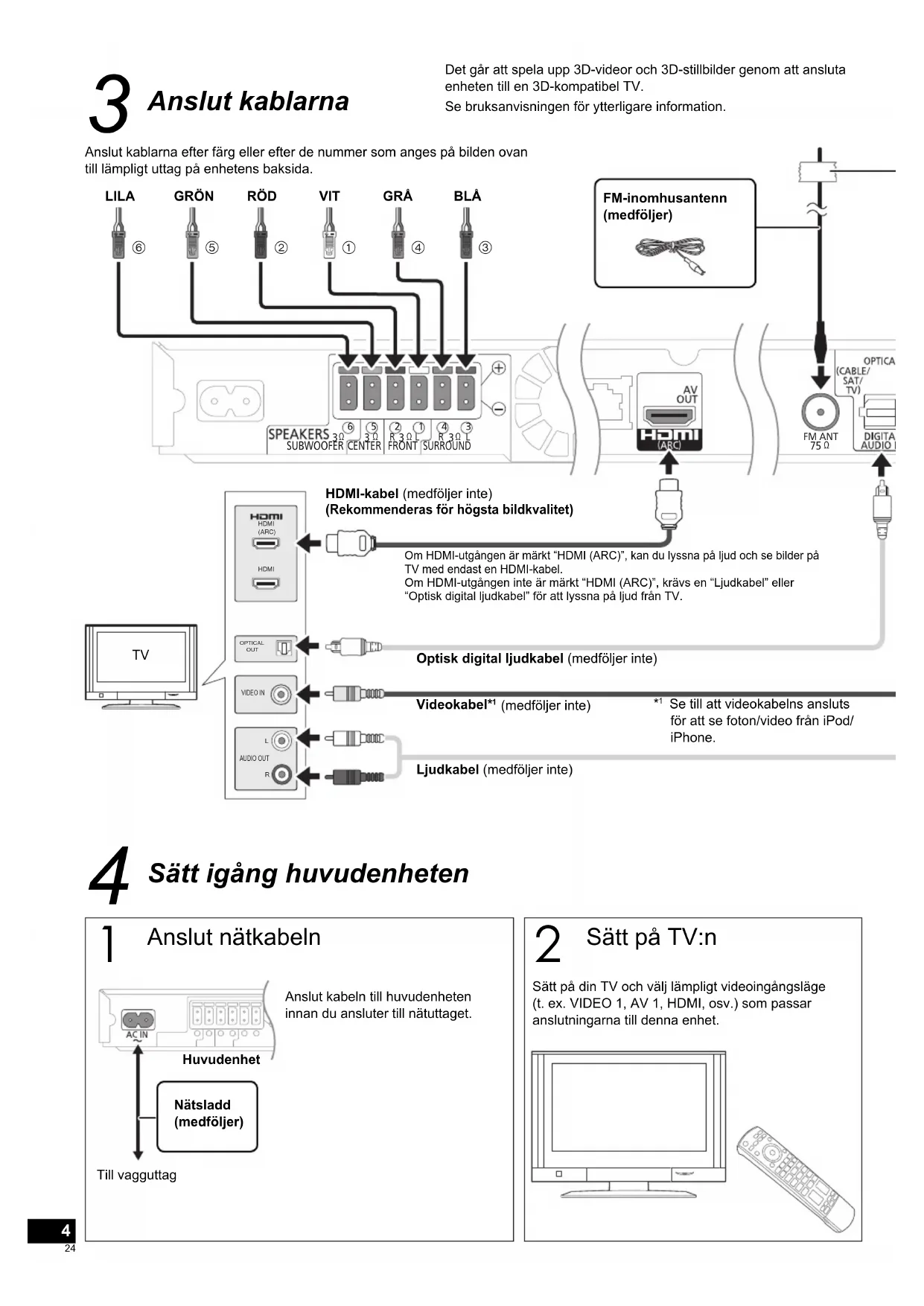 Se till att videokabelns ansluts för att se foton/video från iPod/ iPhone. Det går att spela upp 3D-videor och 3D-stillbilder genom att ansluta enheten till en 3D-kompatibel TV. Om HDMI-utgången är märkt “HDMI (ARC)”, kan du lyssna på ljud och se bilder på TV med endast en HDMI-kabel. Om HDMI-utgången inte är märkt “HDMI (ARC)”, krävs en “Ljudkabel” eller “Optisk digital ljudkabel” för att lyssna på ljud från TV. Nätsladd (medföljer) SCBTT270EG-VQC8266.indb24SCBTT270EG-VQC8266.indb24 2011/01/1411:35:102011/01/1411:35:1025