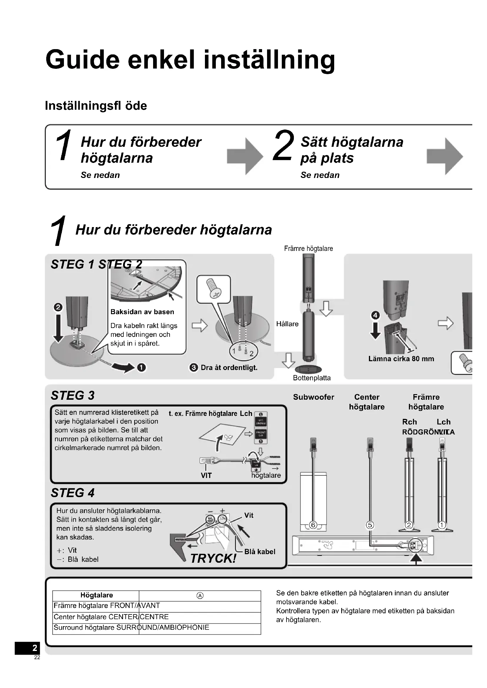 Guide enkel inställning Inställningsfl öde Hur du förbereder högtalarna Se nedan Sätt högtalarna på plats Se nedan Hur du förbereder högtalarna Se den bakre etiketten på högtalaren innan du ansluter motsvarande kabel.Kontrollera typen av högtalare med etiketten på baksidan av högtalaren.Högtalare Främre högtalare FRONT/AVANTCenter högtalare CENTER/CENTRESurround högtalare SURROUND/AMBIOPHONIESätt en numrerad klisteretikett på varje högtalarkabel i den position som visas på bilden. Se till att numren på etiketterna matchar det cirkelmarkerade numret på bilden.Hur du ansluter högtalarkablarna.Sätt in kontakten så långt det går, men inte så sladdens isolering kan skadas.: Vit : Blå kabelt. ex. Främre högtalare Lch TRYCK! Främre högtalare Center högtalare Subwoofer STEG 3 STEG 4 STEG 1 STEG 2 VIT Vit Blå kabelDra åt ordentligt.Lämna cirka 80 mmHållareBottenplattahögtalare Lch VIT Rch RÖDGRÖNLILAFrämre högtalareBaksidan av basenDra kabeln rakt längs med ledningen och skjut in i spåret. SCBTT770EG-VQC8274.indb22SCBTT770EG-VQC8274.indb22 2011/01/1411:25:142011/01/1411:25:1423