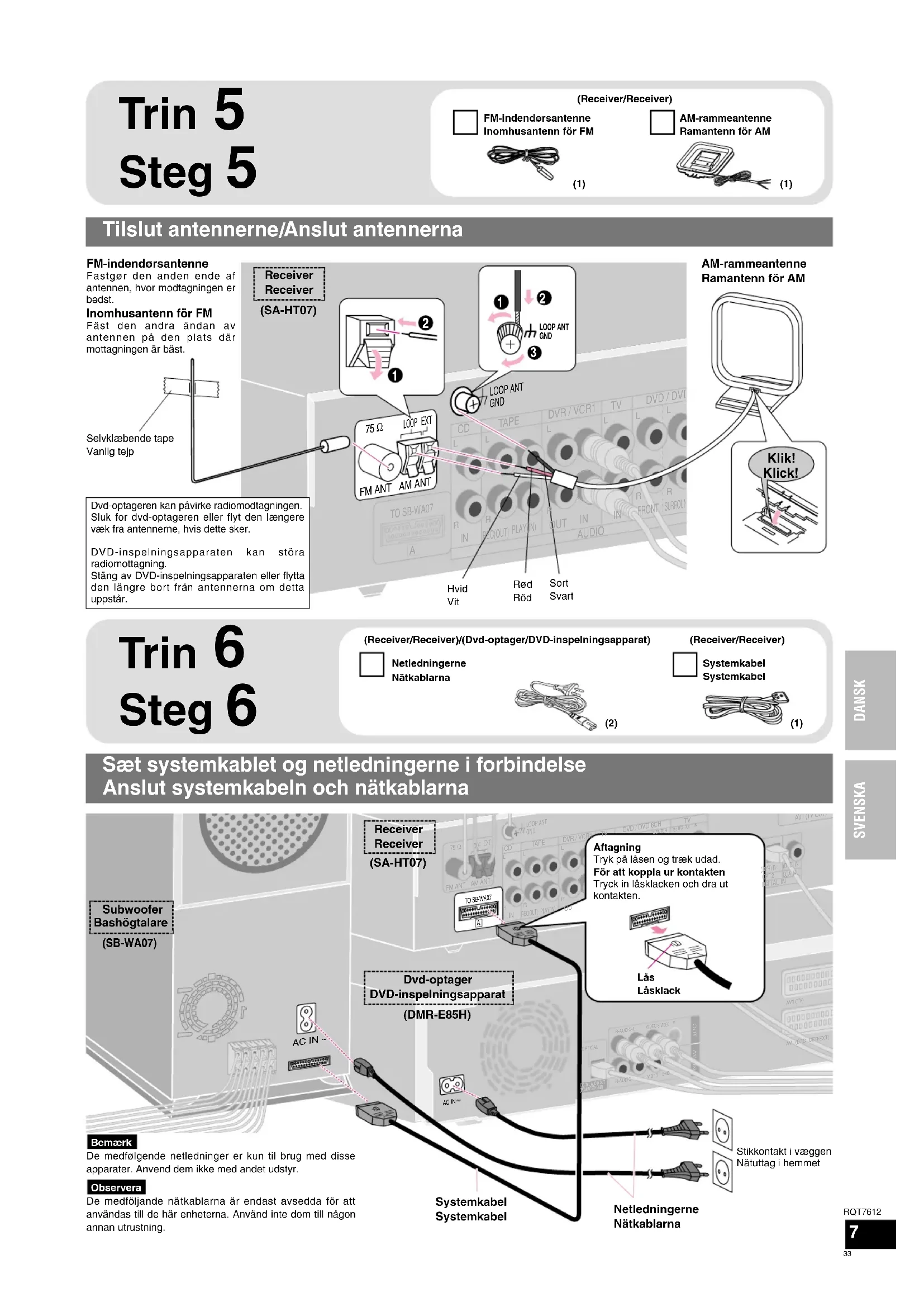 Steg 4 Lyd/videokabelLjud-/bildkabel(Dvd-optager/DVD-inspelningsapparat)RF-koaksialkabelRF koaxialkabelVideokabler(medfølger ikke)Videokablar(medföljer ej)Antenneledning (medfølger ikke)Antennkabel (medföljer ej)Lyd/videokabel Ljud-/bildkabel Til antennenTill antennenRF-koaksialkabel RF koaxialkabelCOMPONENT VIDEO-terminalDisse terminaler kan anvendes tilenten interface eller progressivoutput og giver et renere billede.Uttaget COMPONENT VIDEODessa uttag kan användas förantingen sammanflätad ellerprogressiv utmatning och ger en bildsom är ännu renare.Videokabler (medfølger ikke)Videokablar (medföljer ej)ReceiverReceiver(SA-HT07)Dvd-optagerDVD-inspelningsapparat(DMR-E85H)LyslederkabelOptisk fiberkabelLyslederkabelOptisk fiberkabel TV eller monitorTV-apparat ellerTV-monitor(medfølger ikke)(medföljer ej)(1) (1) (1) (3) Tilslutning til et fjernsyn (skærm) med en COMPONENT VIDEO IN-terminal Anslutning till en TV (monitor) med COMPONENT VIDEO IN-ingång