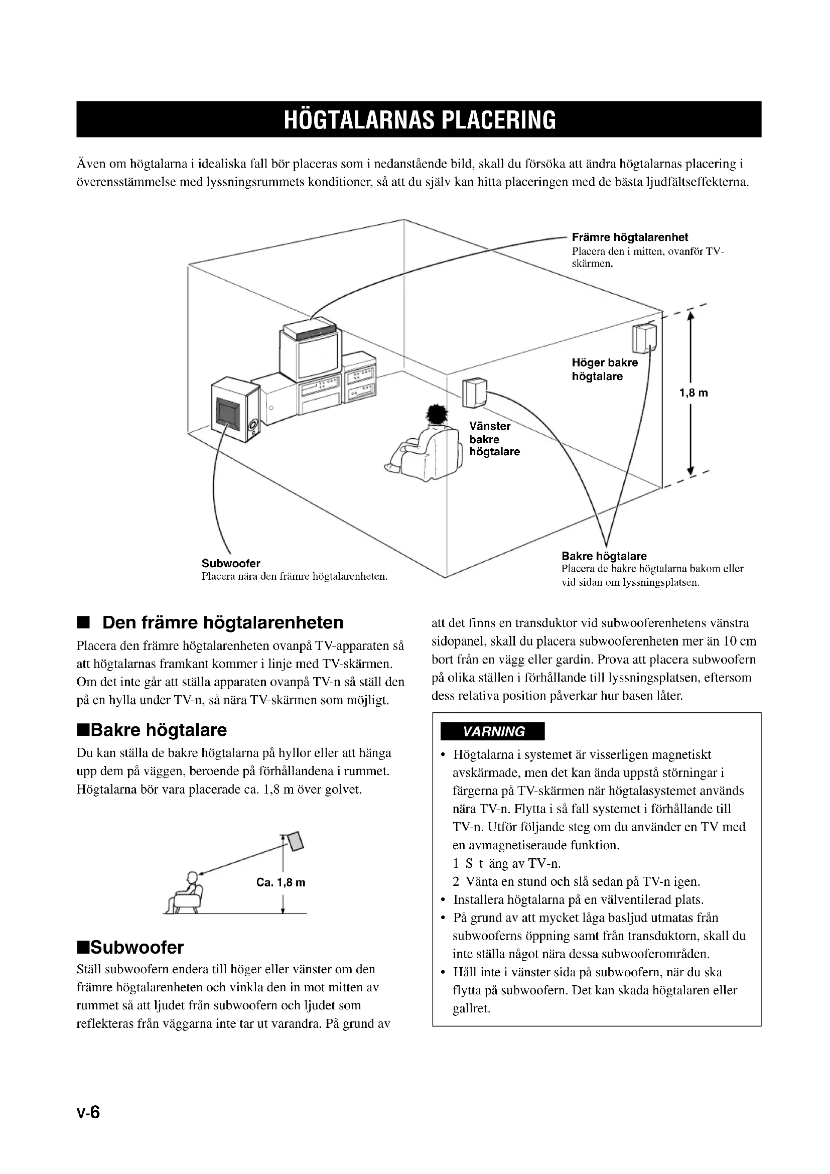 (sidan 27) Manöverknappar för TV-mottagare, videobandspelare eller DVD- spelare (sidorna 33 till 35)V-6 att det finns en transduktor vid subwooferenhetens vänstra sidopanel, skall du placera subwooferenheten mer än 10 cm bort från en vägg eller gardin. Prova att placera subwoofern på olika ställen i förhållande till lyssningsplatsen, eftersom dess relativa position påverkar hur basen låter. VARNING