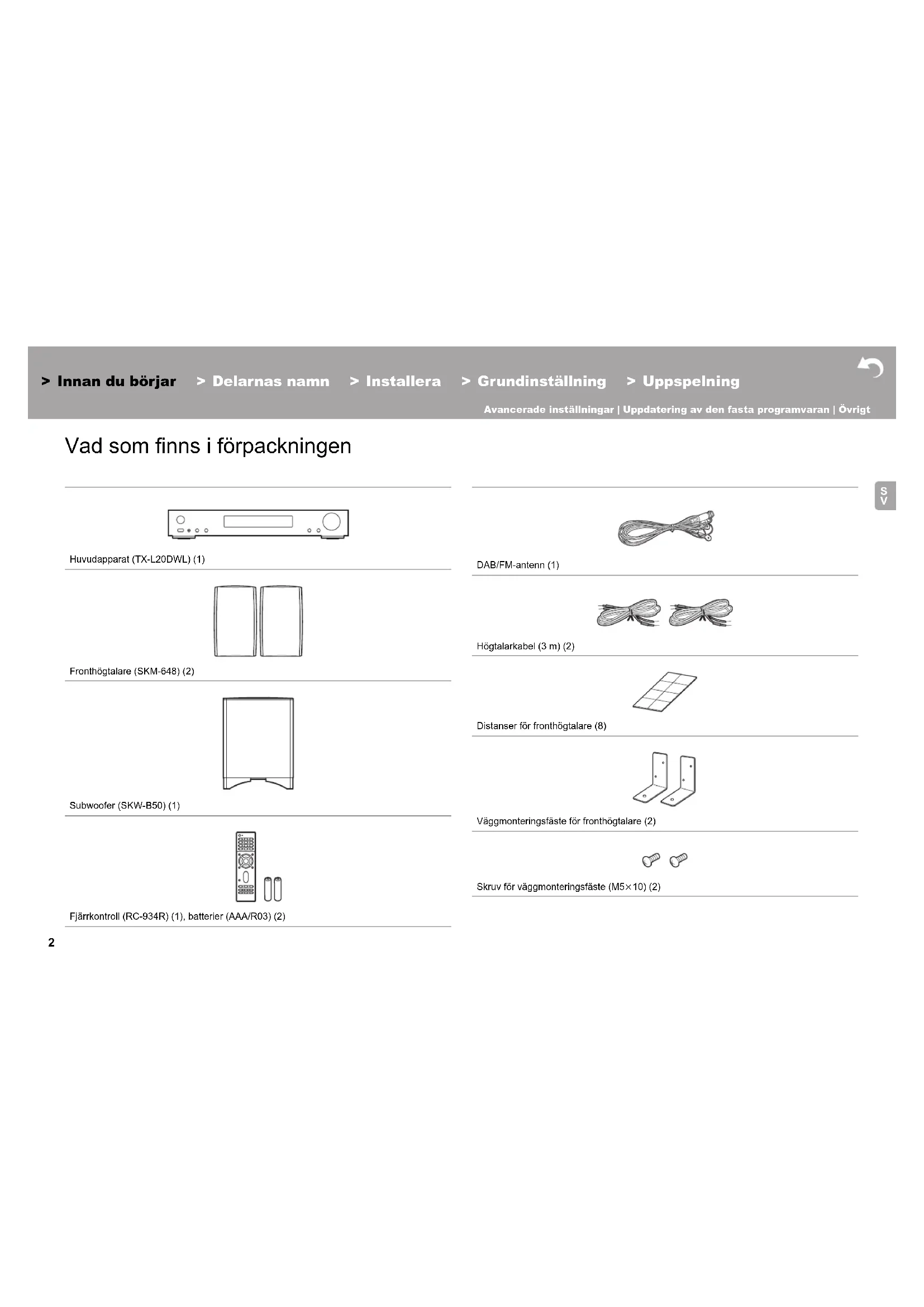 Innan du börjar Vad som finns i förpackningen Huvudapparat (TX-L20DWL) (1) Fronthögtalare (SKM-648) (2) Subwoofer (SKW-B50) (1) Fjärrkontroll (RC-934R) (1), batterier (AAA/R03) (2) DAB/FM-antenn (1) Högtalarkabel (3 m) (2) Distanser för fronthögtalare (8) Väggmonteringsfäste för fronthögtalare (2) Skruv för väggmonteringsfäste (M5k10) (2)3 > Innan du börjar > Delarnas namn > Installera > Grundinställning > Uppspelning Avancerade inställningar | Uppdatering av den fasta programvaran | Övrigt