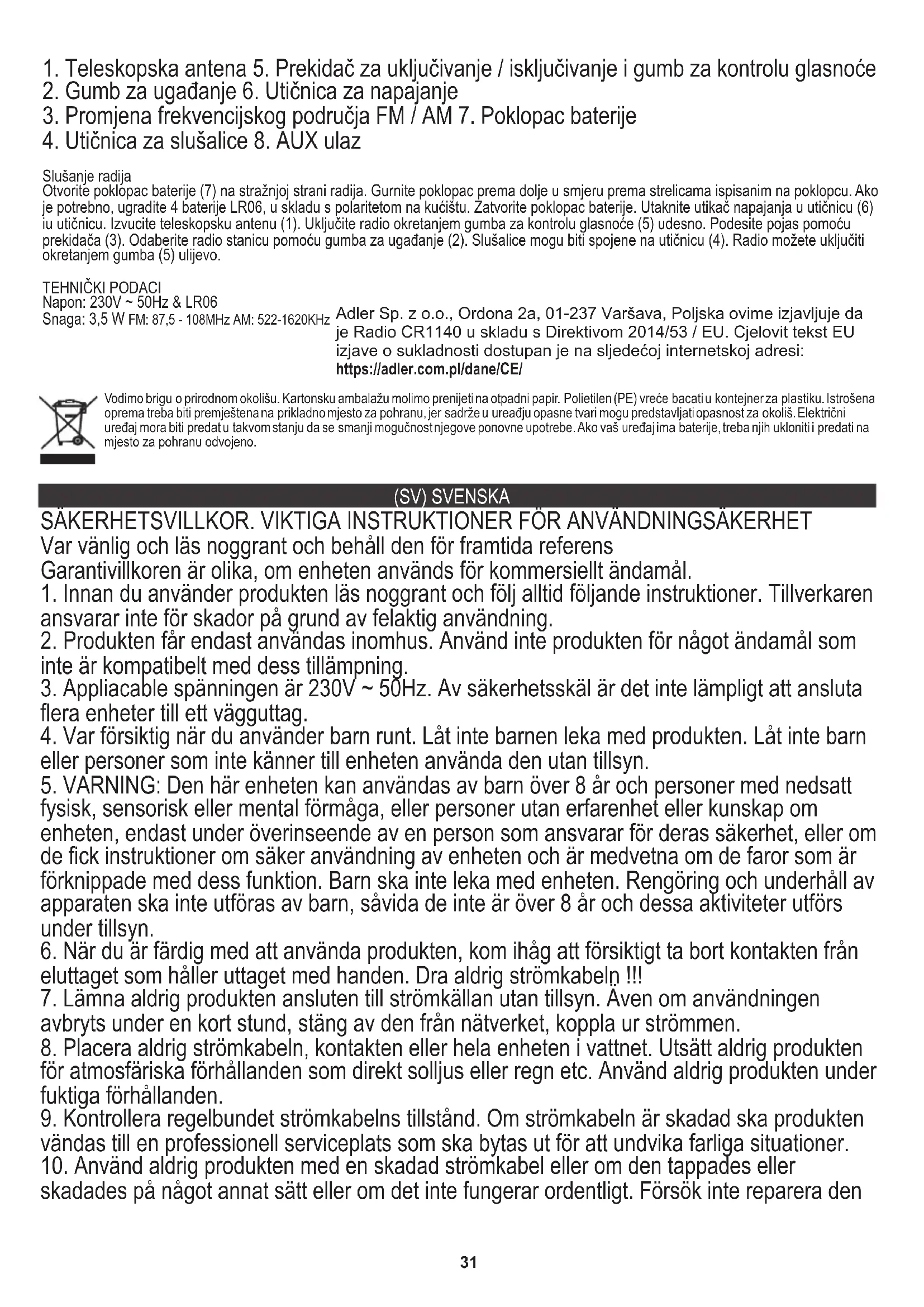 skadades på något annat sätt eller om det inte fungerar ordentligt. Försök inte reparera den Adler Sp. z o.o., Ordona 2a, 01-237 Varšava, Poljska ovime izjavljuje da je Radio CR1140 u skladu s Direktivom 2014/53 / EU. Cjelovit tekst EU izjave o sukladnosti dostupan je na sljedećoj internetskoj adresi: https://adler.com.pl/dane/CE/32 defekta produkten själv eftersom det kan leda till elektrisk stöt. Vänd alltid den skadade enheten till en professionell serviceplats för att reparera den. Alla reparationer kan endast utföras av auktoriserade servicepersonal. Den reparation som gjordes felaktigt kan orsaka farliga situationer för användaren.