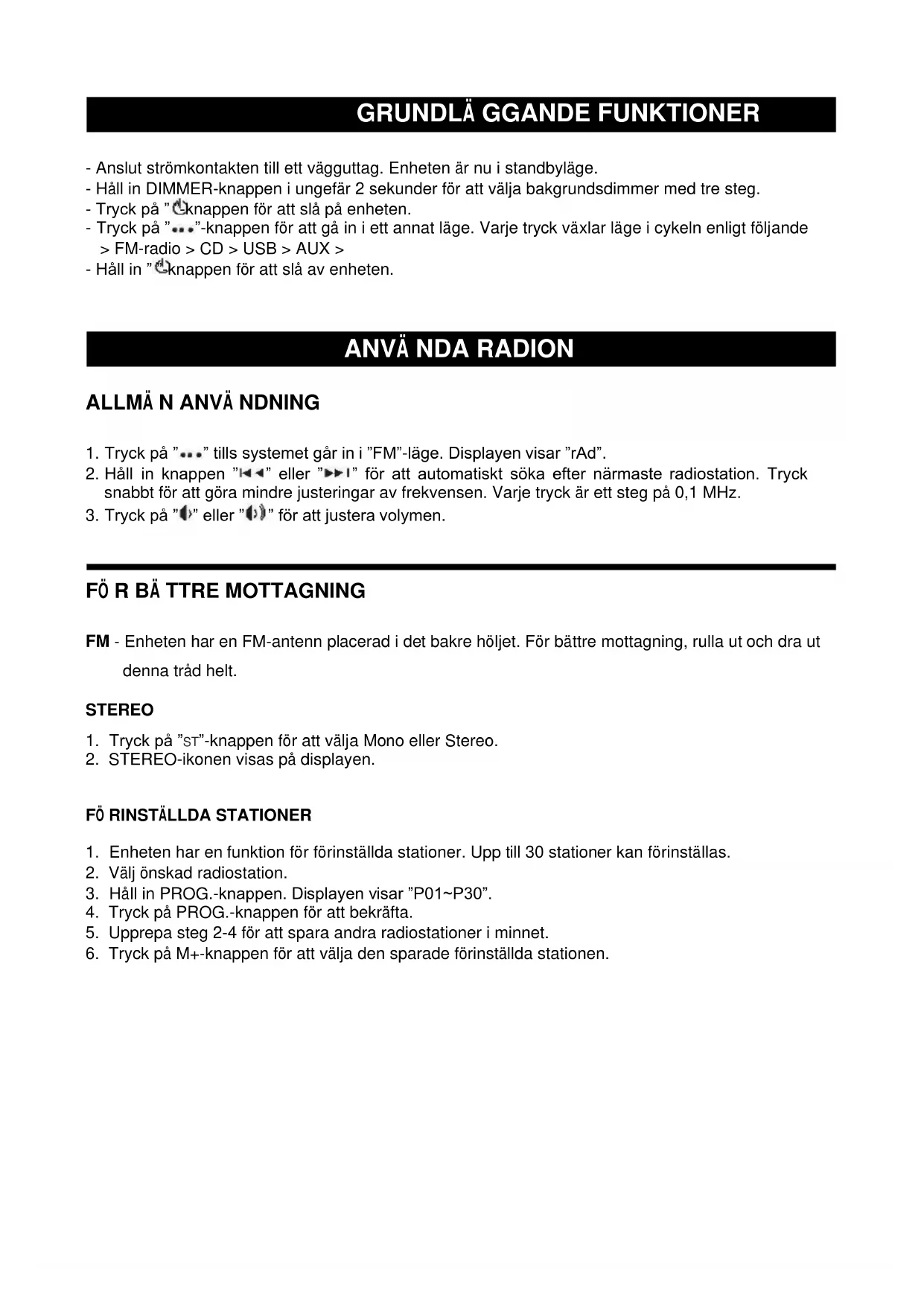 - Enheten har en Funktion for forinstallda stationer. Upp till 30 stationer kan forinstallas.