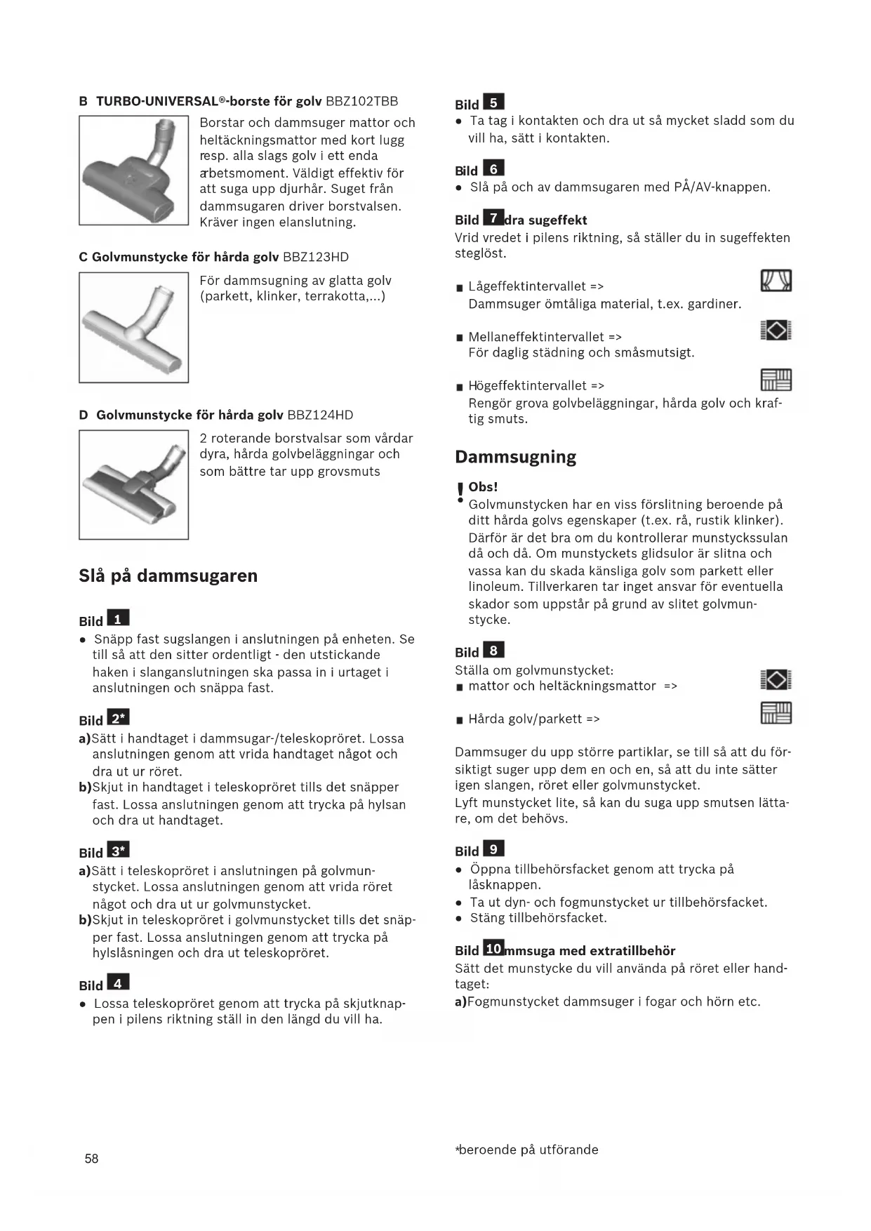S60. I denna bruksanvisning visas olika GS60-modeller. Där- för kan det hända att inte all beskriven utrustning gäller för din modell. Använd endast originaltillbehör från Bosch som är särskilt utvecklade för din dammsugare för att uppnå bästa sugeffekt. Veckla ut bildsidorna! Beskrivning av produkten 1 Ställbart golvmunstycke med tillbehörsfäste 2 Teleskoprör med skjutmuff och tillbehörsfäste 3 Handtag 4 Slang 5 Fällbart bärhandtag 6 Dammbehållare 7 Sladd 8 Utblåsfilterkåpa 9 På/AV-knapp med elektronisk sugeffektinställning 10 Effektindikering 11 Munstycksparkering på maskinsidan 12 Clean-knapp (filterrengöring)* 13 Tillbehörsfack 14 Munstycksparkering på maskinens baksida 15 Möbelmunstycke 16 Fogmunstycke 17 Veckfilter 18 Luddfilter 19 Specialmunstycke för hårda golv* 20 TURBO-UNIVERSAL®-borste för golv* Reservdelar och extratillbehör A TURBO-UNIVERSAL®-borste för dynor BBZ42TB Borstar och dammsuger polstrade möbler, madrasser, bilsäten osv. i ett enda arbetsmoment. Väldigt effektiv för att suga upp djurhår. Suget från dammsugaren driver borstvalsen. Kräver ingen elanslutning.