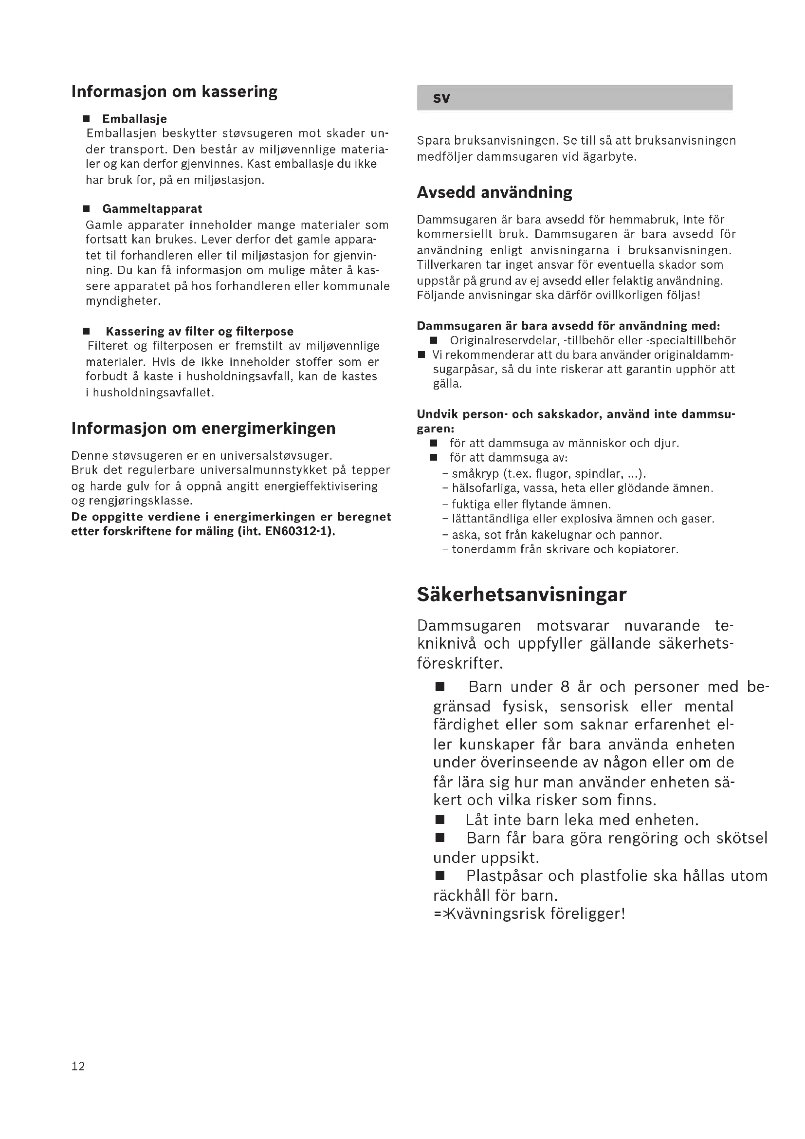 Observera! Går säkringen när du startar dammsugaren, kan det bero på att du har andra elprodukter med hög effekt anslutna samtidigt till samma avsäkring (propp). Ställ in enheten på lägsta effektläget innan du slår på och öka sedan effekt, så går inte säkringen. Avfallshantering Förpackningen Förpackningen skyddar dammsugaren från skador vid transporten. Förpackningen är gjord av miljövän- liga material och går att återvinna. Släng förpack- ningsmaterial du inte längre behöver i återvinningen. Uttjänt enhet Uttjänta enheter innehåller ofta värdefulla material. Lämna därför in din uttjänta dammsugare till din återförsäljare resp. släng den i återvinningen. Infor- mation om återvinning får du hos din återförsäljare eller kommun. Kassering av filter och dammpåse Filter och dammpåse är tillverkade i miljövänliga ma- terial. Om de inte innehåller några förbjudna ämnen kan de kastas i hushållssoporna. Anmärkningar till energideklarationen Dammsugaren är en universaldammsugare. Använd det ställbara universalmunstycket, så uppnår du deklarerad energieffektivitet och klass avseende rengöringsprestanda på mattor och hårda golv. De angivna värdena i energideklarationen är beräkna- de med föreskriven mätmetod (enligt EN60312-1).14