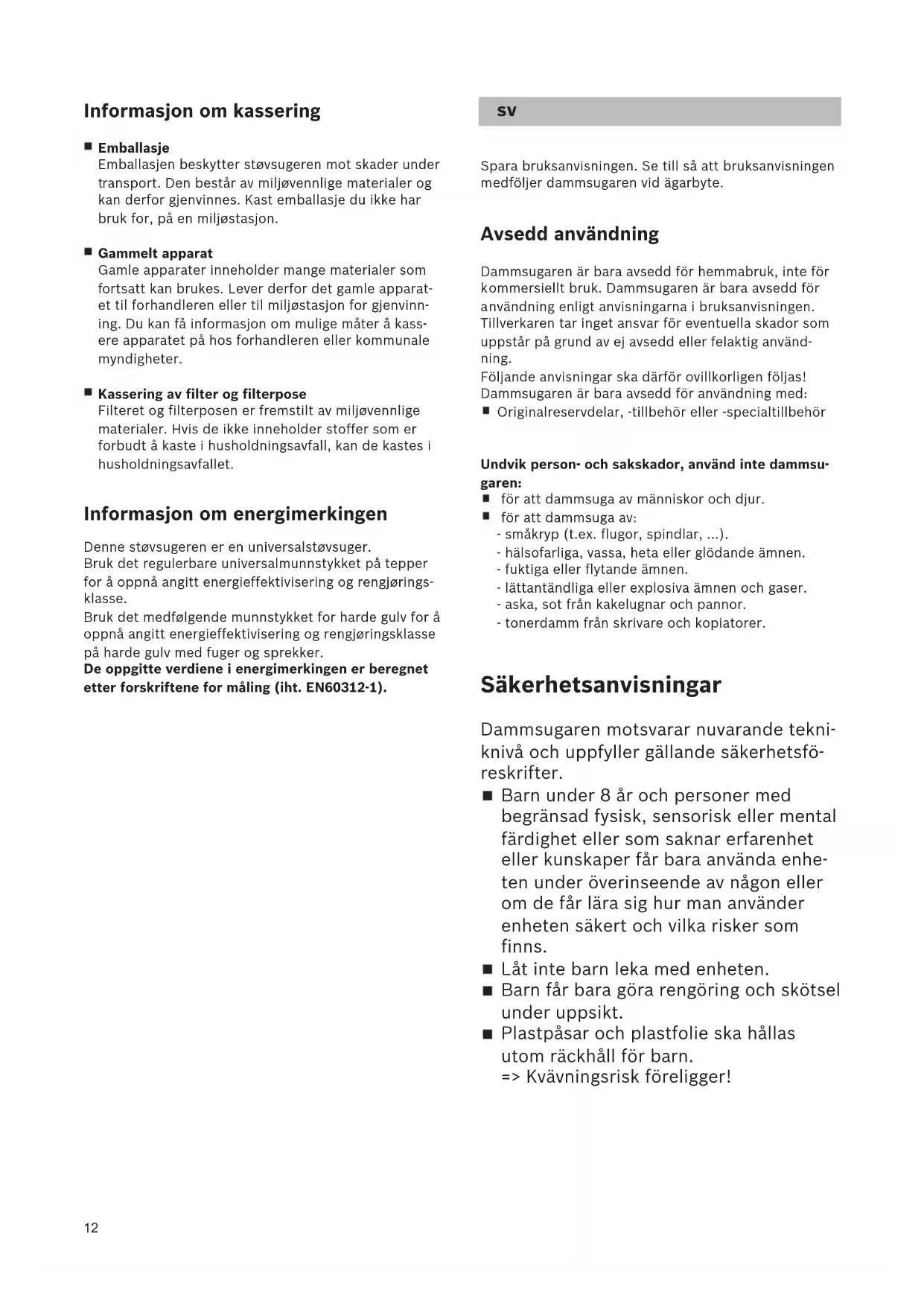 nvändning enligt anvisningarna i bruksanvisningen. Tillverkaren tar inget ansvar för eventuella skador som uppstår på grund av ej avsedd eller felaktig använd- ning. Följande anvisningar ska därför ovillkorligen följas! Dammsugaren är bara avsedd för användning med: Originalreservdelar, -tillbehör eller -specialtillbehör Undvik person- och sakskador, använd inte dammsu- garen: för att dammsuga av människor och djur. för att dammsuga av: - småkryp (t.ex. flugor, spindlar, ...). - hälsofarliga, vassa, heta eller glödande ämnen. - fuktiga eller flytande ämnen. - lättantändliga eller explosiva ämnen och gaser. - aska, sot från kakelugnar och pannor. - tonerdamm från skrivare och kopiatorer. Säkerhetsanvisningar Dammsugaren motsvarar nuvarande tekni- knivå och uppfyller gällande säkerhetsfö- reskrifter. Barn under 8 år och personer med begränsad fysisk, sensorisk eller mental färdighet eller som saknar erfarenhet eller kunskaper får bara använda enhe- ten under överinseende av någon eller om de får lära sig hur man använder enheten säkert och vilka risker som finns. Låt inte barn leka med enheten. Barn får bara göra rengöring och skötsel under uppsikt. Plastpåsar och plastfolie ska hållas utom räckhåll för barn. => Kvävningsrisk föreligger!13 Avfallshantering Förpackningen