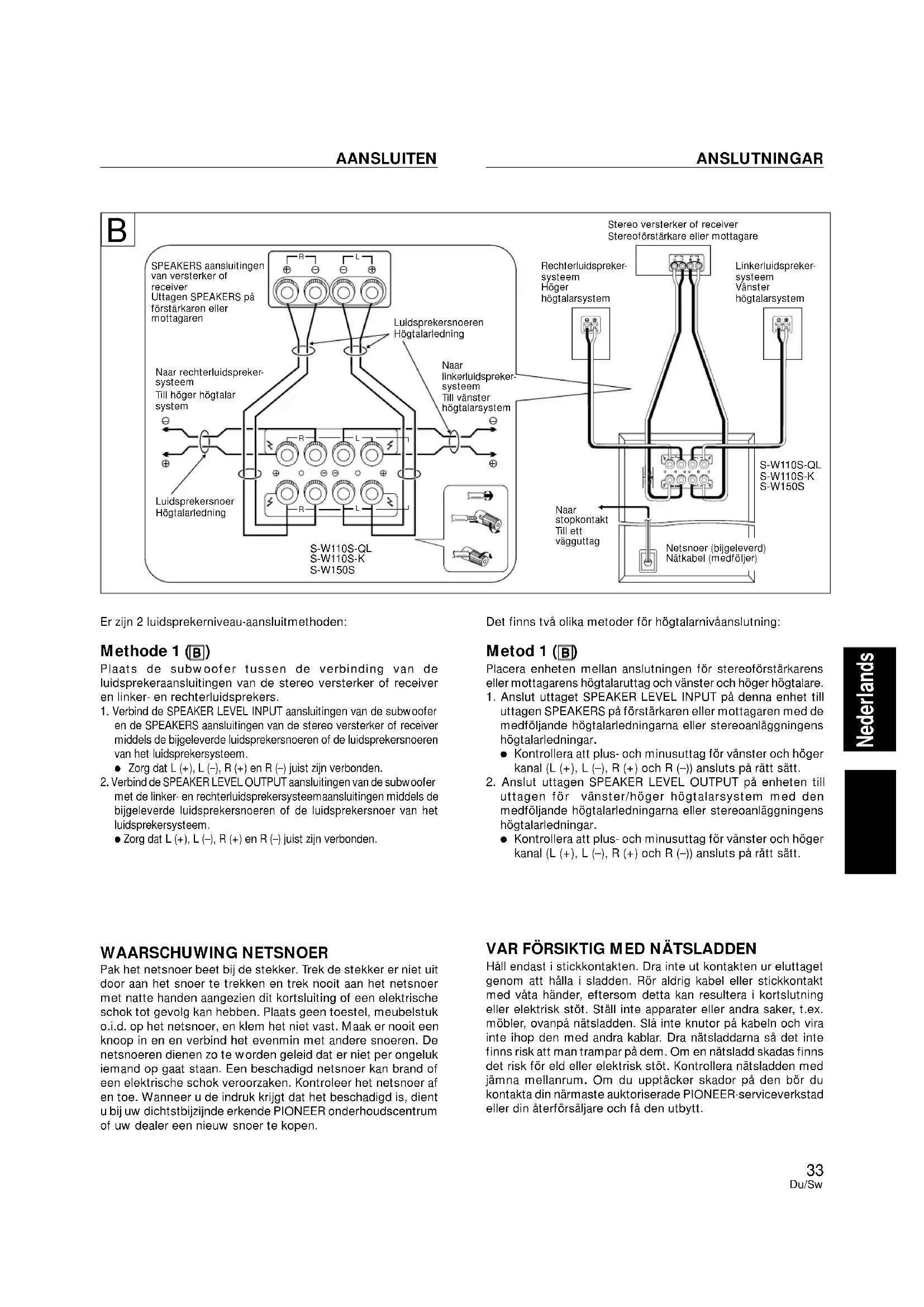Om stereoförstärkaren eller mottagaren har två uppsättningar högtalaruttag (A, B) och dessa är anslutna till tomma uttag på enheten samtidigt som "A + B" väljs med högtalaromkopplaren, kan det hända att ljudet inte utgår från vänster/höger högtalare, beroende på förstärkaren eller mottagaren som används (d.v.s. en förstärkare eller mottagare som är konstruerad så att A och B blir seriekopplade när "A + B" väljs med högtalaromkopplaren). AANSLUITEN ANSLUTNINGAR Netsnoer (bijgeleverd) Nätkabel (medföljer)EnglishFrançaisDeutsch Nederlands ItalianoSvenskaEspañolPortuguês