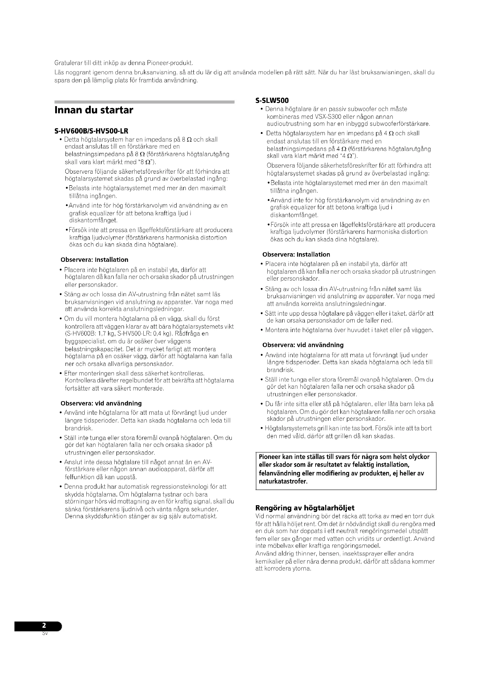 Gratulerar till ditt inköp av denna Pioneer-produkt. Läs noggrant igenom denna bruksanvisning, så att du lär dig att använda modellen på rätt sätt. När du har läst bruksanvisningen, skall du spara den på lämplig plats för framtida användning. Innan du startar S-HV600B/S-HV500-LR
