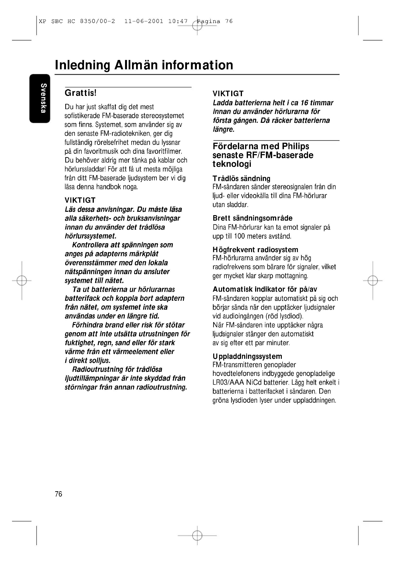 Grattis! Du har just skaffat dig det mest sofistikerade FM-baserade stereosystemet som finns. Systemet, som använder sig av den senaste FM-radiotekniken, ger dig fullständig rörelsefrihet medan du lyssnar på din favoritmusik och dina favoritfilmer. Du behöver aldrig mer tänka på kablar och hörlurssladdar! För att få ut mesta möjliga från ditt FM-baserade ljudsystem ber vi dig läsa denna handbok noga. VIKTIGT Läs dessa anvisningar. Du måste läsa alla säkerhets- och bruksanvisningar innan du använder det trådlösa hörlurssystemet. Kontrollera att spänningen som anges på adapterns märkplåt överensstämmer med den lokala nätspänningen innan du ansluter systemet till nätet. Ta ut batterierna ur hörlurarnas batterifack och koppla bort adaptern från nätet, om systemet inte ska användas under en längre tid. Förhindra brand eller risk för stötar genom att inte utsätta utrustningen för fuktighet, regn, sand eller för stark värme från ett värmeelement eller i direkt solljus. Radioutrustning för trådlösa ljudtillämpningar är inte skyddad från störningar från annan radioutrustning. VIKTIGT Ladda batterierna helt i ca 16 timmar innan du använder hörlurarna för första gången. Då räcker batterierna längre. Fördelarna med Philips senaste RF/FM-baserade teknologi Trådlös sändning FM-sändaren sänder stereosignalen från din ljud- eller videokälla till dina FM-hörlurar utan sladdar. Brett sändningsområde Dina FM-hörlurar kan ta emot signaler på upp till 100 meters avstånd. Högfrekvent radiosystem FM-hörlurarna använder sig av hög radiofrekvens som bärare för signaler, vilket ger mycket klar skarp mottagning. Automatisk indikator för på/av FM-sändaren kopplar automatiskt på sig och börjar sända när den upptäcker ljudsignaler vid audioingången (röd lysdiod). När FM-sändaren inte upptäcker några ljudsignaler stänger den automatiskt av sig efter ett par minuter. Uppladdningssystem FM-transmitteren genoplader hovedtelefonens indbyggede genopladelige LR03/AAA NiCd batterier. Lägg helt enkelt i batterierna i batterifacket i sändaren. Den gröna lysdioden lyser under uppladdningen. Inledning Allmän information XP SBC HC 8350/00-2 11-06-2001 10:47 Pagina 76Svenska