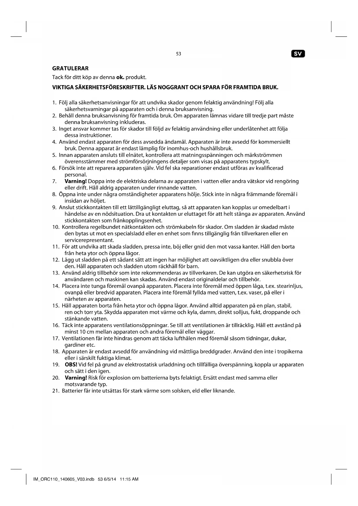 KASSERING Logotypen med den överkorsade soptunnan kräver separat insamling av avfall som innehåller elektriska eller elektroniska produkter (WEEE). Elektrisk och elektronisk utrustning kan innehålla farliga och skadliga ämnen. Släng inte denna apparat som osorterat avfall. Lämna in den till en uppsamlingsplats för återvinning av WEEE. På så sätt hjälper du till att bevara resurser och skydda miljön. Kontakta din återförsäljare eller lokala myndigheter för mer information. IM_ORC110_140605_V03.indb 57 6/5/14 11:15 AM58