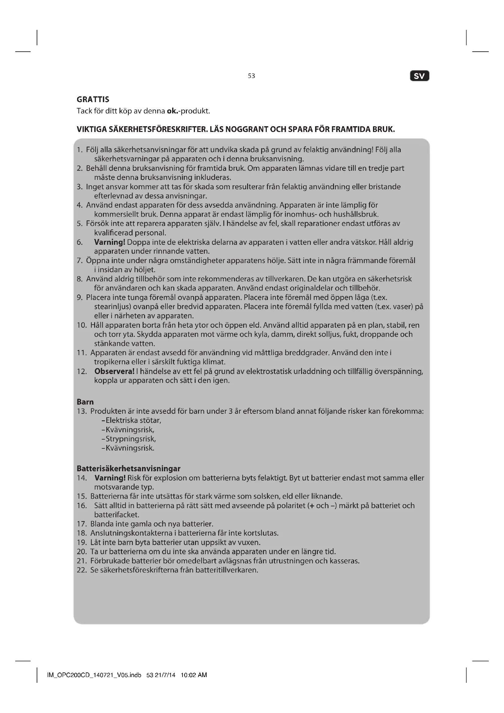 GRATTIS Tack för ditt köp av denna ok.-produkt. VIKTIGA SÄKERHETSFÖRESKRIFTER. LÄS NOGGRANT OCH SPARA FÖR FRAMTIDA BRUK.