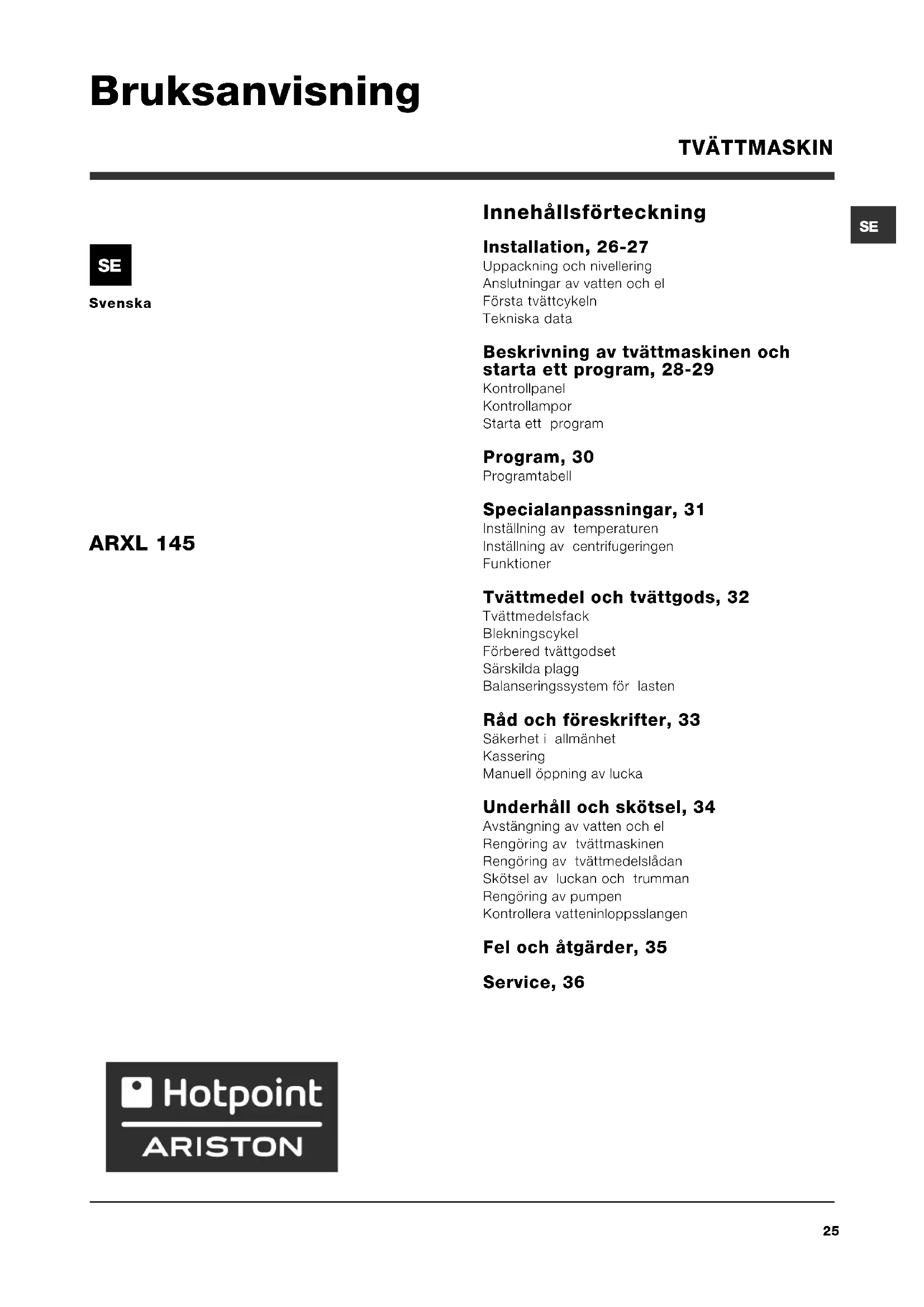 BRUKSANVISNING ARXL 145 EU HOTPOINT ARISTON