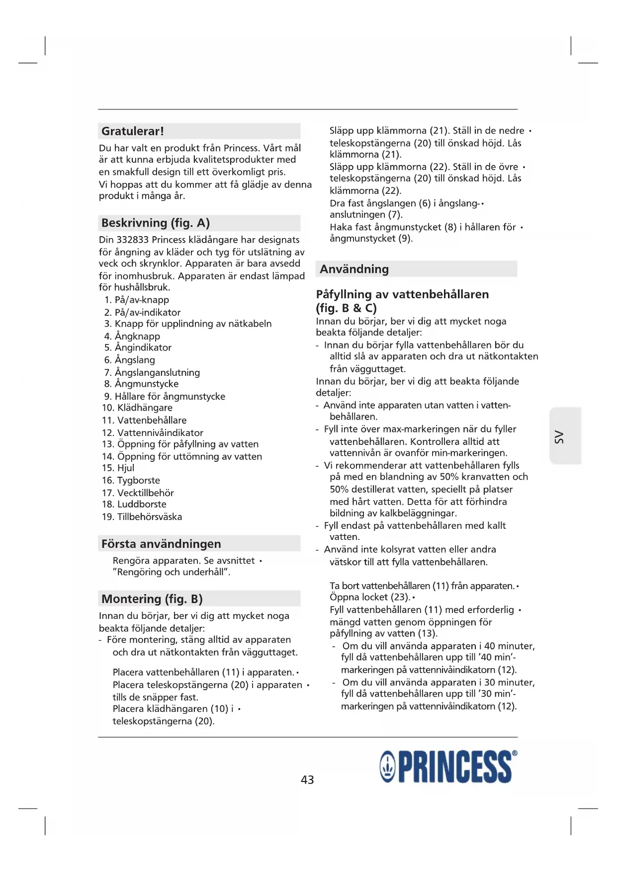 Gratulerar! Du har valt en produkt från Princess. Vårt mål är att kunna erbjuda kvalitetsprodukter med en smakfull design till ett överkomligt pris. Vi hoppas att du kommer att få glädje av denna produkt i många år. Beskrivning (fig. A) Din 332833 Princess klädångare har designats för ångning av kläder och tyg för utslätning av veck och skrynklor. Apparaten är bara avsedd för inomhusbruk. Apparaten är endast lämpad för hushållsbruk.