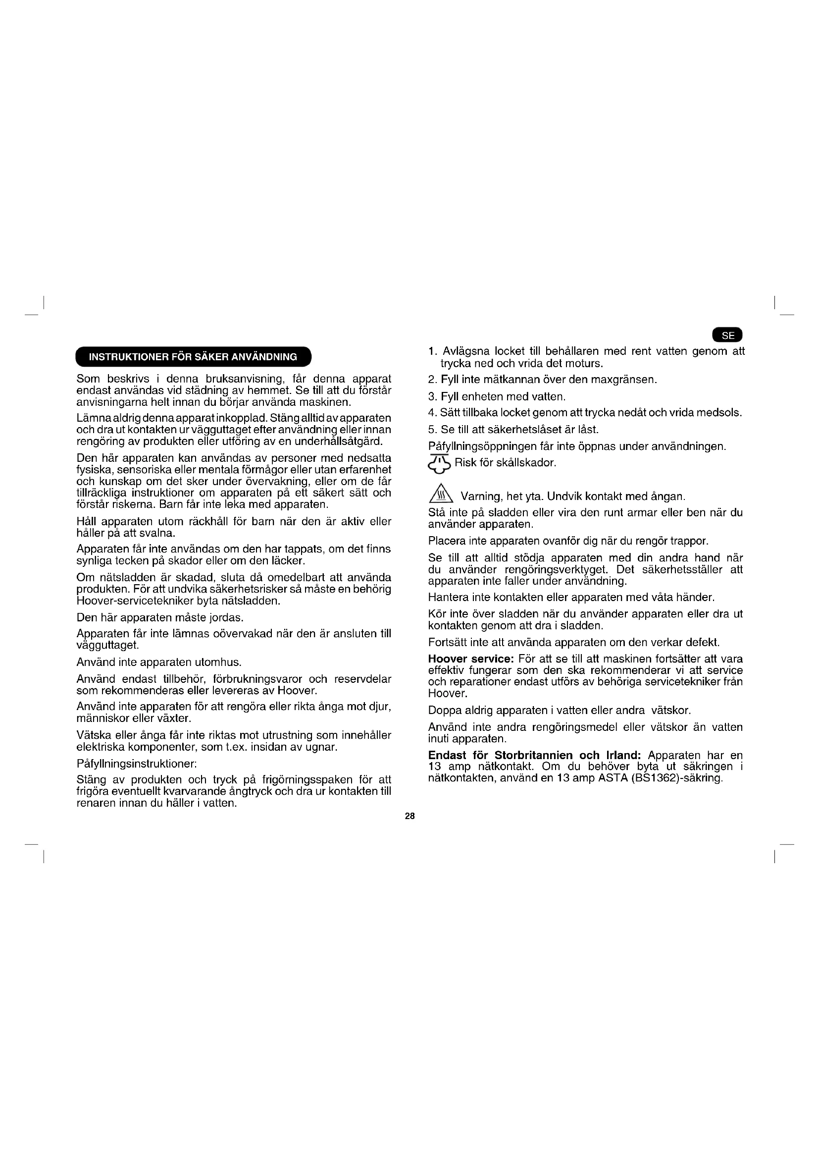 INSTRUKTIONER FÖR SÄKER ANVÄNDNING Som beskrivs i denna bruksanvisning, får denna apparat endast användas vid städning av hemmet. Se till att du förstår anvisningarna helt innan du börjar använda maskinen. Lämna aldrig denna apparat inkopplad. Stäng alltid av apparaten och dra ut kontakten ur vägguttaget efter användning eller innan rengöring av produkten eller utföring av en underhållsåtgärd. Den här apparaten kan användas av personer med nedsatta fysiska, sensoriska eller mentala förmågor eller utan erfarenhet och kunskap om det sker under övervakning, eller om de får tillräckliga instruktioner om apparaten på ett säkert sätt och förstår riskerna. Barn får inte leka med apparaten. Håll apparaten utom räckhåll för barn när den är aktiv eller håller på att svalna. Apparatenfårinteanvändasomdenhartappats,omdetnns synliga tecken på skador eller om den läcker. Om nätsladden är skadad, sluta då omedelbart att använda produkten. För att undvika säkerhetsrisker så måste en behörig Hoover-servicetekniker byta nätsladden. Den här apparaten måste jordas. Apparaten får inte lämnas oövervakad när den är ansluten till vägguttaget. Använd inte apparaten utomhus. Använd endast tillbehör, förbrukningsvaror och reservdelar som rekommenderas eller levereras av Hoover. Använd inte apparaten för att rengöra eller rikta ånga mot djur, människor eller växter. Vätska eller ånga får inte riktas mot utrustning som innehåller elektriska komponenter, som t.ex. insidan av ugnar. Påfyllningsinstruktioner: Stäng av produkten och tryck på frigörningsspaken för att frigöra eventuellt kvarvarande ångtryck och dra ur kontakten till renaren innan du häller i vatten.