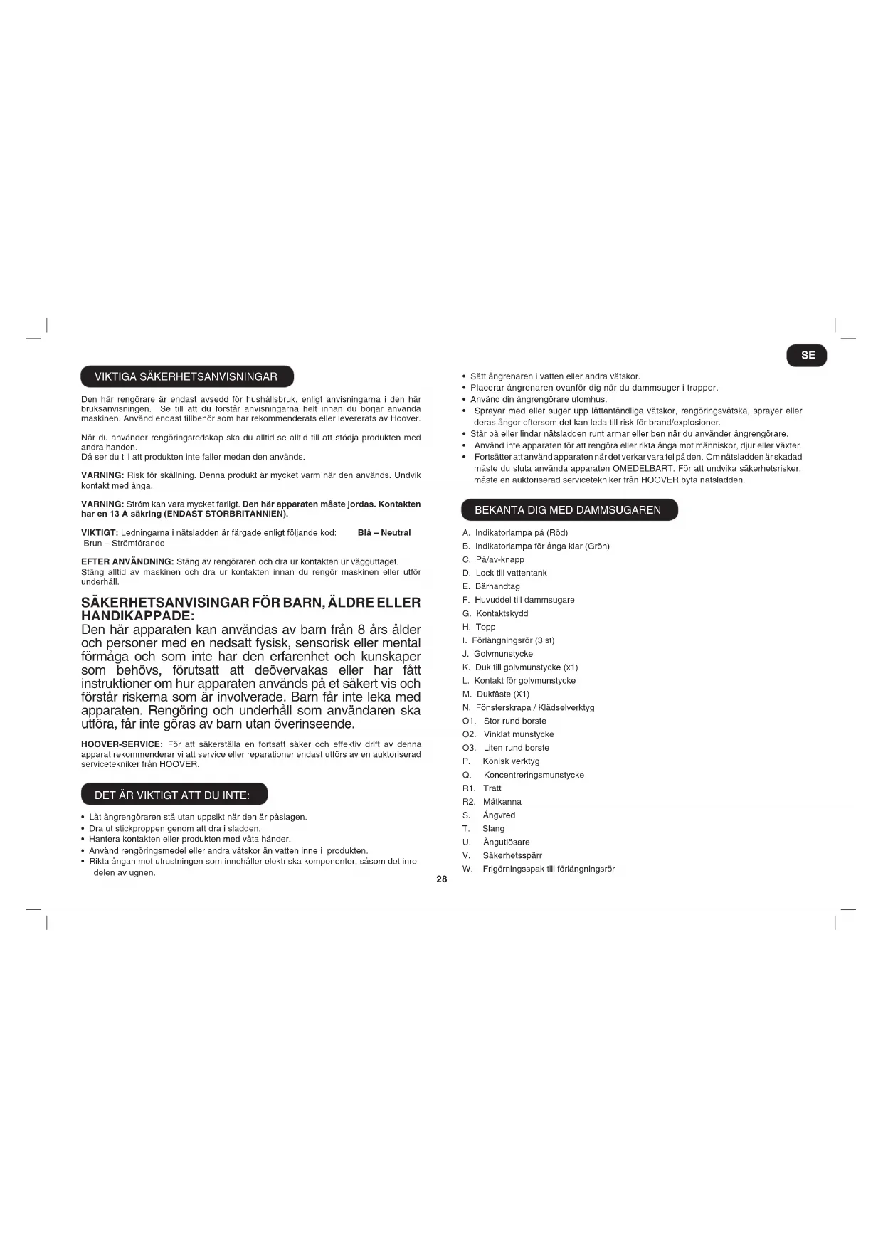 Den här rengörare är endast avsedd för hushållsbruk, enligt anvisningarna i den här bruksanvisningen. Se till att du förstår anvisningarna helt innan du börjar använda maskinen. Använd endast tillbehör som har rekommenderats eller levererats av Hoover. När du använder rengöringsredskap ska du alltid se alltid till att stödja produkten med andra handen. Då ser du till att produkten inte faller medan den används. VARNING: Risk för skållning. Denna produkt är mycket varm när den används. Undvik kontakt med ånga. VARNING: Ström kan vara mycket farligt. Den här apparaten måste jordas. Kontakten har en 13 A säkring (eNDAsT sToRBRITANNIeN). VIKTIGT: Ledningarna i nätsladden är färgade enligt följande kod: Blå – Neutral Brun – Strömförande efTeR ANVÄNDNING: Stäng av rengöraren och dra ur kontakten ur vägguttaget. Stäng alltid av maskinen och dra ur kontakten innan du rengör maskinen eller utför underhåll. sÄKeRHeTsANVIsINGAR fÖR BARN, ÄlDRe elleR HANDIKAppADe: Den här apparaten kan användas av barn från 8 års ålder och personer med en nedsatt fysisk, sensorisk eller mental förmåga och som inte har den erfarenhet och kunskaper som behövs, förutsatt att deövervakas eller har fått instruktioner om hur apparaten används på et säkert vis och förstår riskerna som är involverade. Barn får inte leka med apparaten. Rengöring och underhåll som användaren ska utföra, får inte göras av barn utan överinseende. HooVeR-seRVICe: För att säkerställa en fortsatt säker och effektiv drift av denna apparat rekommenderar vi att service eller reparationer endast utförs av en auktoriserad servicetekniker från HOOVER. DET ÄR VIKTIGT ATT DU INTE: