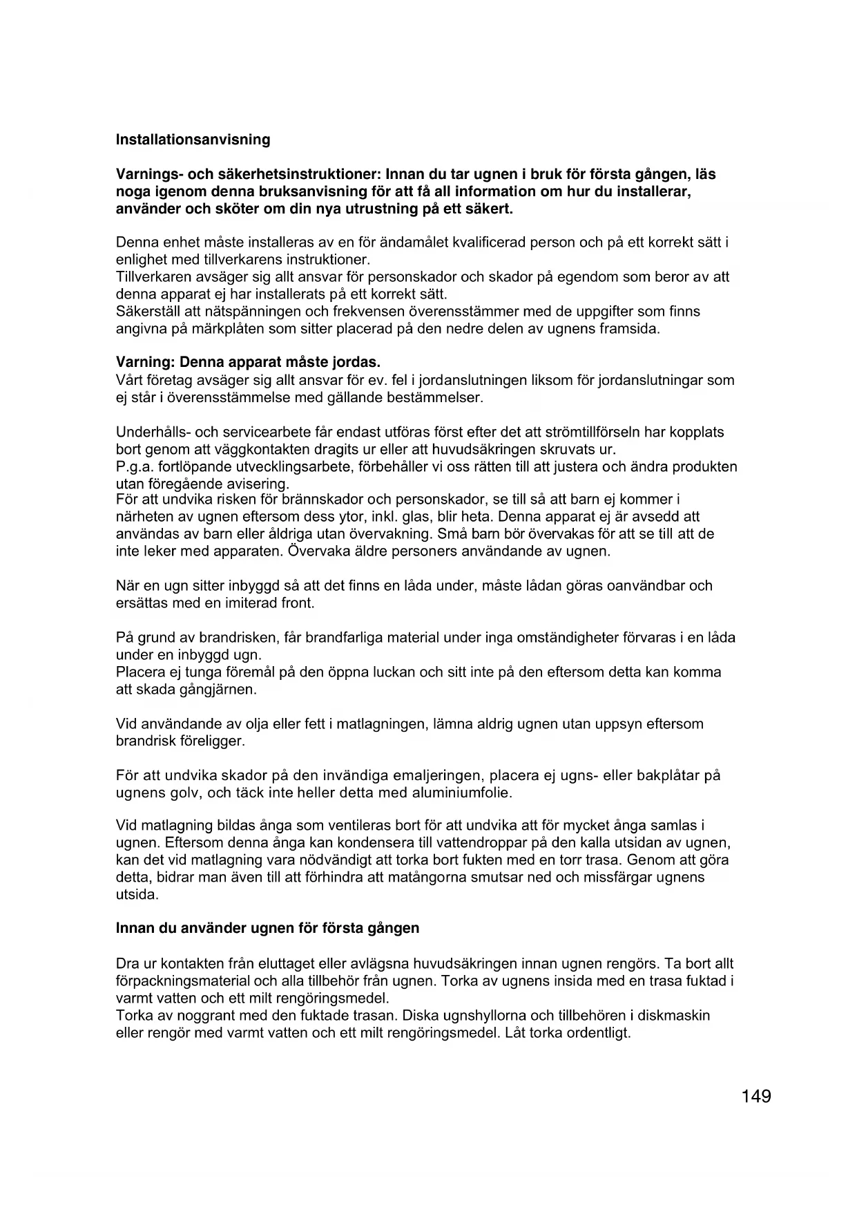 Poznámka: (*) = Police se po ítají shora. Troubu je p ed pou itím t eba p edeh át. Tyto funkce je t eba pou ívat na k ehká jídla anebo p edeh áté nádobí. ..... Je mo né péci s tímté nádobím v r zných vý kách polic (doba pe ení je shodná). 148Installationsanvisning Varnings- och säkerhetsinstruktioner: Innan du tar ugnen i bruk för första gången, läs noga igenom denna bruksanvisning för att få all information om hur du installerar, använder och sköter om din nya utrustning på ett säkert. Denna enhet måste installeras av en för ändamålet kvalificerad person och på ett korrekt sätt i enlighet med tillverkarens instruktioner. Tillverkaren avsäger sig allt ansvar för personskador och skador på egendom som beror av att denna apparat ej har installerats på ett korrekt sätt. Säkerställ att nätspänningen och frekvensen överensstämmer med de uppgifter som finns angivna på märkplåten som sitter placerad på den nedre delen av ugnens framsida. Varning: Denna apparat måste jordas. Vårt företag avsäger sig allt ansvar för ev. fel i jordanslutningen liksom för jordanslutningar som ej står i överensstämmelse med gällande bestämmelser. Underhålls- och servicearbete får endast utföras först efter det att strömtillförseln har kopplats bort genom att väggkontakten dragits ur eller att huvudsäkringen skruvats ur. P.g.a. fortlöpande utvecklingsarbete, förbehåller vi oss rätten till att justera och ändra produkten utan föregående avisering. För att undvika risken för brännskador och personskador, se till så att barn ej kommer i närheten av ugnen eftersom dess ytor, inkl. glas, blir heta. Denna apparat ej är avsedd att användas av barn eller åldriga utan övervakning. Små barn bör övervakas för att se till att de inte leker med apparaten. Övervaka äldre personers användande av ugnen. När en ugn sitter inbyggd så att det finns en låda under, måste lådan göras oanvändbar och ersättas med en imiterad front. På grund av brandrisken, får brandfarliga material under inga omständigheter förvaras i en låda under en inbyggd ugn. Placera ej tunga föremål på den öppna luckan och sitt inte på den eftersom detta kan komma att skada gångjärnen. Vid användande av olja eller fett i matlagningen, lämna aldrig ugnen utan uppsyn eftersom brandrisk föreligger. För att undvika skador på den invändiga emaljeringen, placera ej ugns- eller bakplåtar på ugnens golv, och täck inte heller detta med aluminiumfolie. Vid matlagning bildas ånga som ventileras bort för att undvika att för mycket ånga samlas i ugnen. Eftersom denna ånga kan kondensera till vattendroppar på den kalla utsidan av ugnen, kan det vid matlagning vara nödvändigt att torka bort fukten med en torr trasa. Genom att göra detta, bidrar man även till att förhindra att matångorna smutsar ned och missfärgar ugnens utsida. Innan du använder ugnen för första gången Dra ur kontakten från eluttaget eller avlägsna huvudsäkringen innan ugnen rengörs. Ta bort allt förpackningsmaterial och alla tillbehör från ugnen. Torka av ugnens insida med en trasa fuktad i varmt vatten och ett milt rengöringsmedel. Torka av noggrant med den fuktade trasan. Diska ugnshyllorna och tillbehören i diskmaskin eller rengör med varmt vatten och ett milt rengöringsmedel. Låt torka ordentligt. 149Teknisk information Denna apparat står i överensstämmelse med standarderna 73/23 CEE och 93/68 CEE EMC 89/336 CEE. Spänning 230 V fas + nollpotential. Inbyggnadsugn – di mensioner: Längd: 440 Djup: 390 Höjd: 340 Volym: 59 l Värmeelementens effektförbrukning Undre värmeelement: 1,3 kW Övre värmeelement: 0,9 kW Grillelement: 1,6 kW Fläktelement (internt fram): 2,3 kW Ugnens maximala effektuttag: 3,1 kW Inbyggnad VIKTIGT! Denna enhet måste installeras i enlighet med tillverkarens instruktioner av en för ändamålet kompetent person. Underhålls- och servicearbete på denna ugn får endast utföras först sedan strömtillförseln kopplats bort. EL-ANSLUTNING. Innan apparaten ansluts till nätuttaget, säkerställ att:
