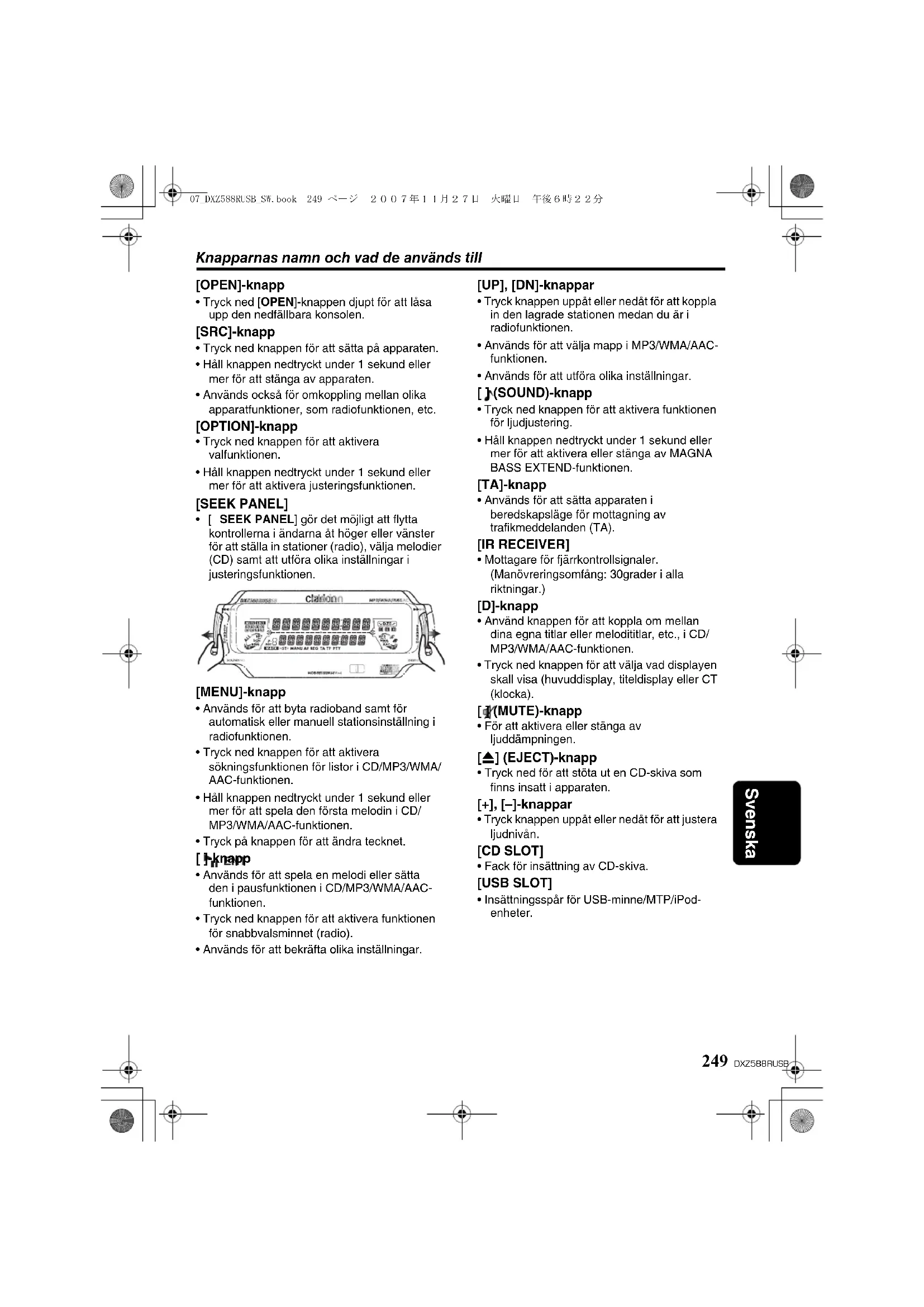 [ ] (EJECT) 07_DXZ588RUSB_SW.book 248 ページ 2007年11月27日 火曜日 午後6時22分Knapparnas namn och vad de används till 249 DXZ588RUSB Svenska [OPEN]-knapp