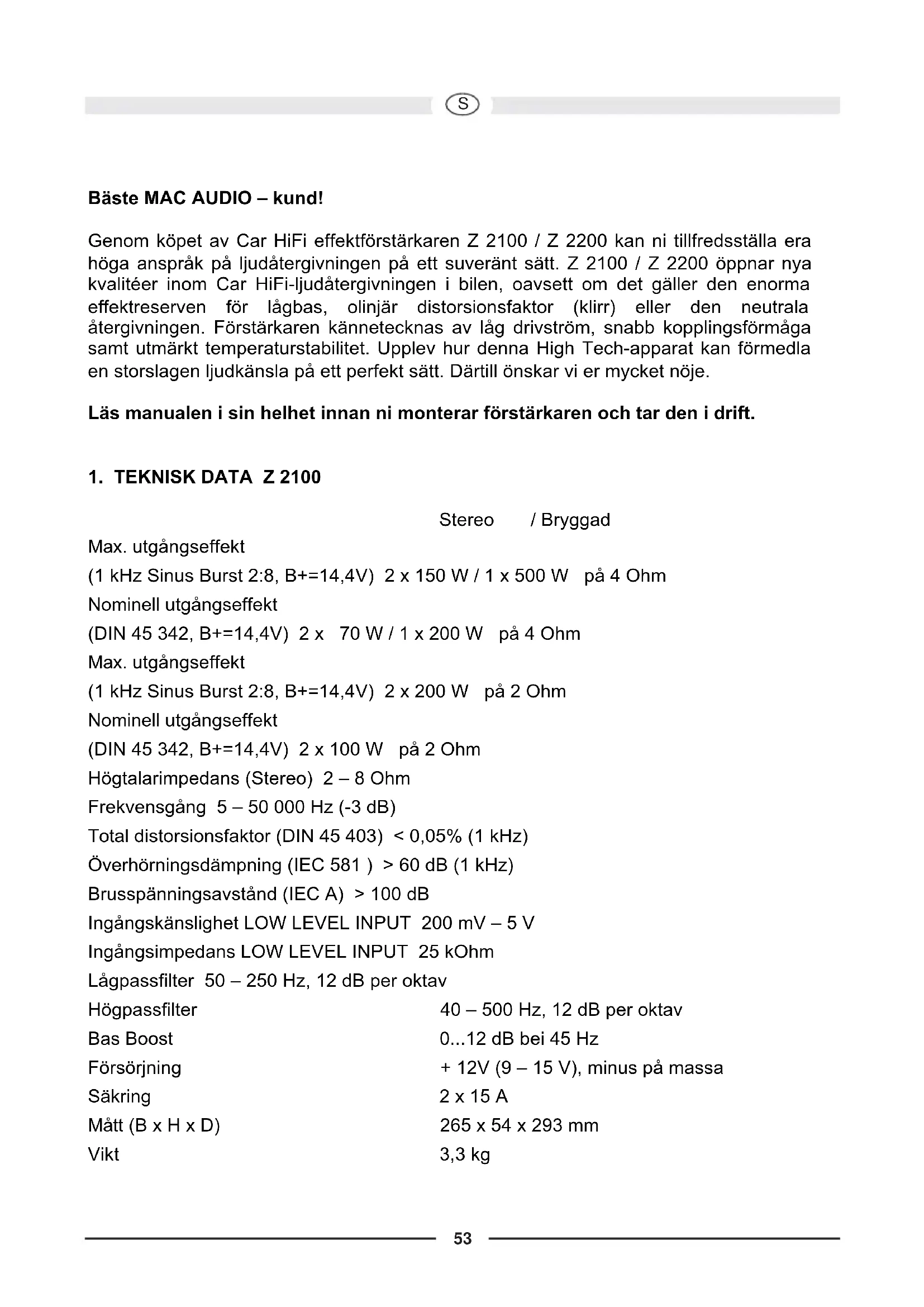 Bäste MAC AUDIO – kund! Genom köpet av Car HiFi effektförstärkaren Z 2100 / Z 2200 kan ni tillfredsställa era höga anspråk på ljudåtergivningen på ett suveränt sätt. Z 2100 / Z 2200 öppnar nya kvalitéer inom Car HiFi-ljudåtergivningen i bilen, oavsett om det gäller den enorma effektreserven för lågbas, olinjär distorsionsfaktor (klirr) eller den neutrala återgivningen. Förstärkaren kännetecknas av låg drivström, snabb kopplingsförmåga samt utmärkt temperaturstabilitet. Upplev hur denna High Tech-apparat kan förmedla en storslagen ljudkänsla på ett perfekt sätt. Därtill önskar vi er mycket nöje. Läs manualen i sin helhet innan ni monterar förstärkaren och tar den i drift.