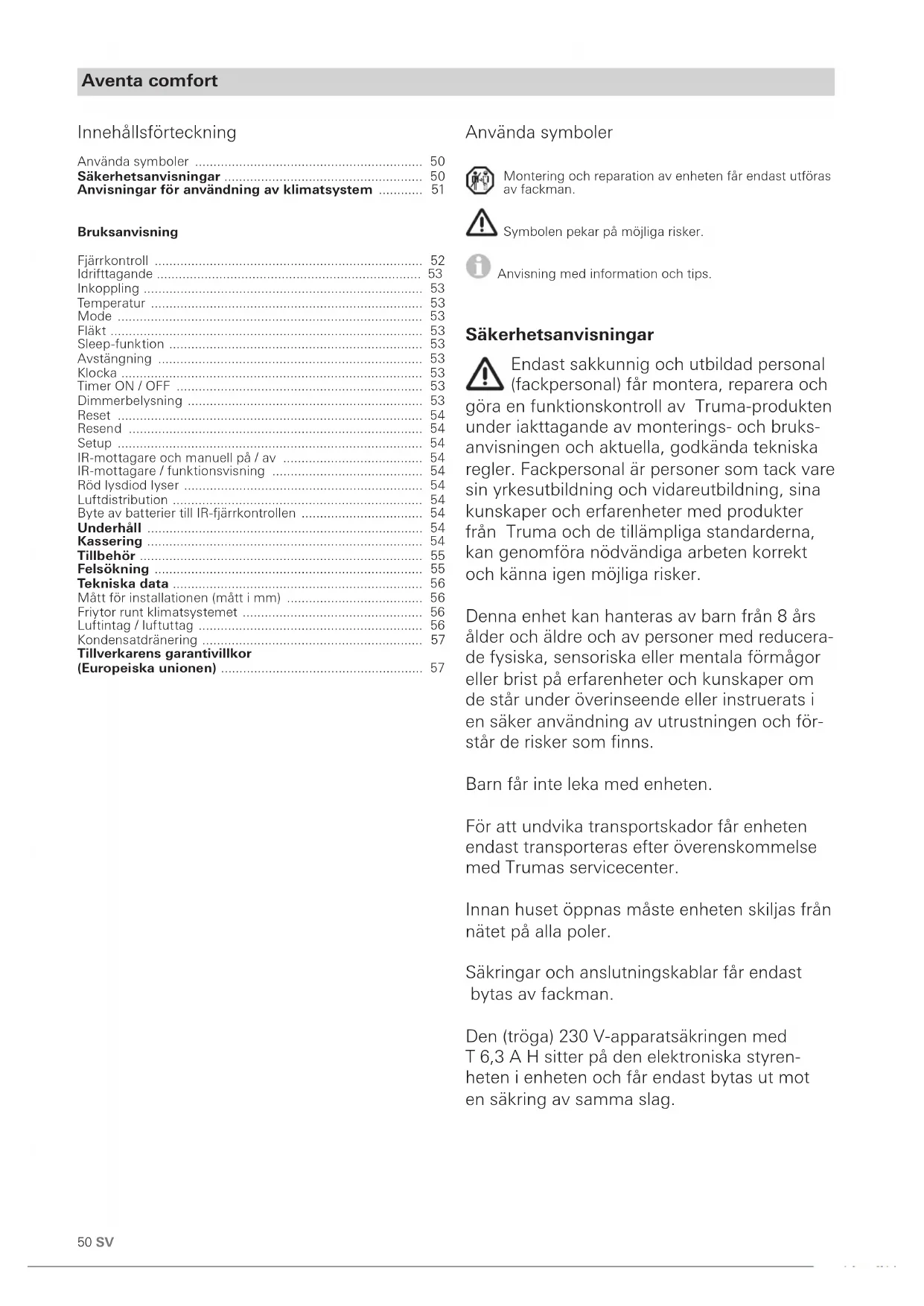 - Garantien gøres gældende hos en autoriseret servicepartner eller i Trumas serviceafdeling. Alle adresser og telefonnumre findes under www.truma.com under faneblandet »Service«. For at sikre et smidigt forløb beder vi om, at man har følgende oplysninger klar ved kontakt: – detaljeret beskrivelse af manglen – anlæggets serienummer – købsdato Den autoriserede servicepartner eller Trumas serviceafdeling fastsætter i det enkelte tilfælde, hvad der skal ske i det videre forløb. For at undgå eventuelle transportskader må det pågæl- dende anlæg kun afsendes efter forudgående aftale med den autoriserede servicepartner eller Trumas serviceafdeling. Hvis garantisagen anerkendes af producenten, påtager produ- centen sig transportomkostningerne. Såfremt der ikke forelig- ger en garantisag, informeres forbrugeren, og reparations- og transportomkostningerne afholdes af denne. Vi anmoder om, at der ikke indsendes anlæg uden forudgåen- de aftale.50 SV Aventa comfort Använda symboler Montering och reparation av enheten får endast utföras av fackman. Symbolen pekar på möjliga risker. Anvisning med information och tips. Säkerhetsanvisningar Endast sakkunnig och utbildad personal (fackpersonal) får montera, reparera och göra en funktionskontroll av Truma-produkten under iakttagande av monterings- och bruks- anvisningen och aktuella, godkända tekniska regler. Fackpersonal är personer som tack vare sin yrkesutbildning och vidareutbildning, sina kunskaper och erfarenheter med produkter från Truma och de tillämpliga standarderna, kan genomföra nödvändiga arbeten korrekt och känna igen möjliga risker. Denna enhet kan hanteras av barn från 8 års ålder och äldre och av personer med reducera- de fysiska, sensoriska eller mentala förmågor eller brist på erfarenheter och kunskaper om de står under överinseende eller instruerats i en säker användning av utrustningen och för- står de risker som finns. Barn får inte leka med enheten. För att undvika transportskador får enheten endast transporteras efter överenskommelse med Trumas servicecenter. Innan huset öppnas måste enheten skiljas från nätet på alla poler. Säkringar och anslutningskablar får endast bytas av fackman. Den (tröga) 230 V-apparatsäkringen med T6,3 A H sitter på den elektroniska styren- heten i enheten och får endast bytas ut mot en säkring av samma slag. Innehållsförteckning Använda symboler p. 50