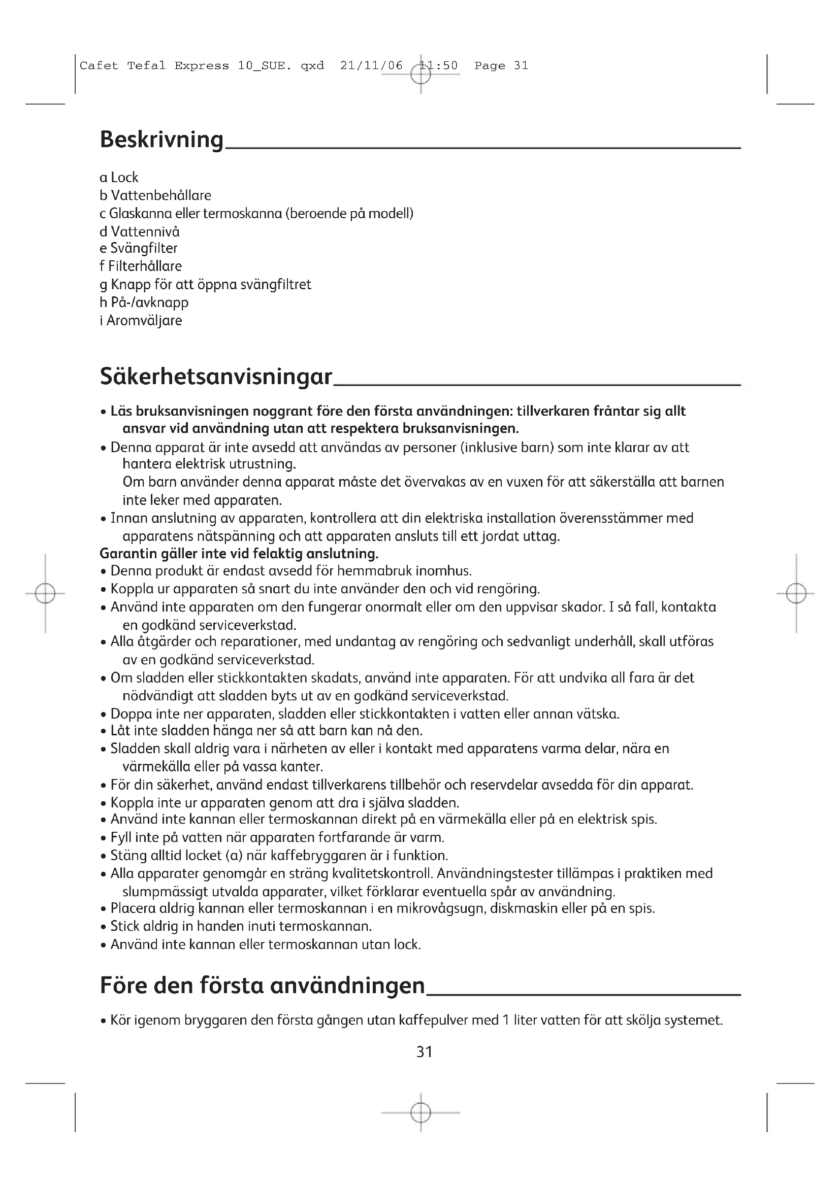 a Lock b Vattenbehållare c Glaskanna eller termoskanna (beroende på modell) d Vattennivå e Svängfilter f Filterhållare g Knapp för att öppna svängfiltret h På-/avknapp i Aromväljare Cafet Tefal Express 10_SUE. qxd 21/11/06 11:50 Page 31Kaffebryggning (Följ bilderna 1 - 8)